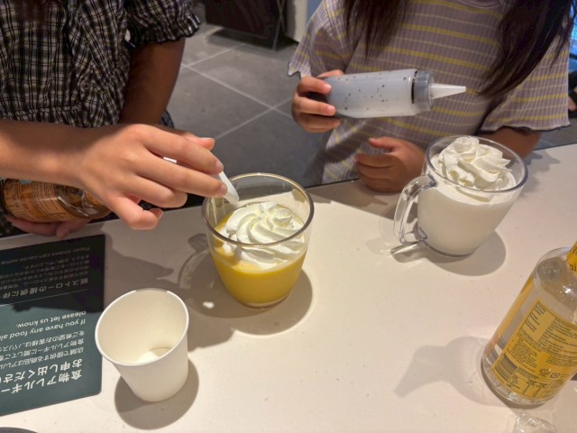 今回は店内利用でグラスだったため使わなかったが、テイクアウトなら子どもの絵がそのままカップに装着され、 “自分だけの作品” になる仕掛けだ。