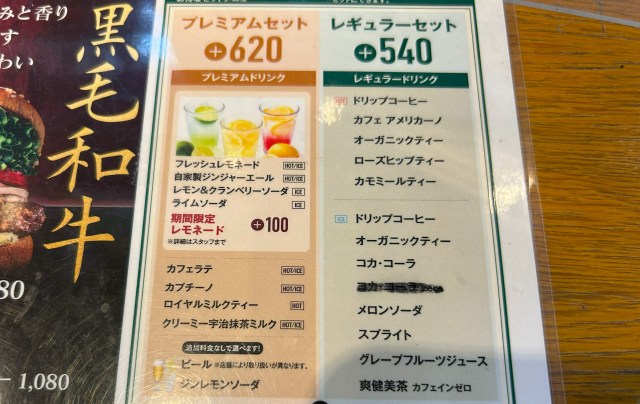 バーガーもしくはホットドッグにポテトなどのサイドメニューとプレミアムドリンクをつけたセット(+620円)だが、ちょっと特別なソフトドリンクだけでなくビールも飲めてしまうのだ。