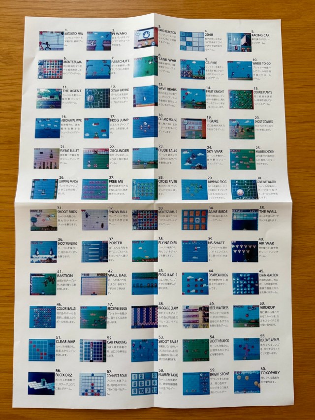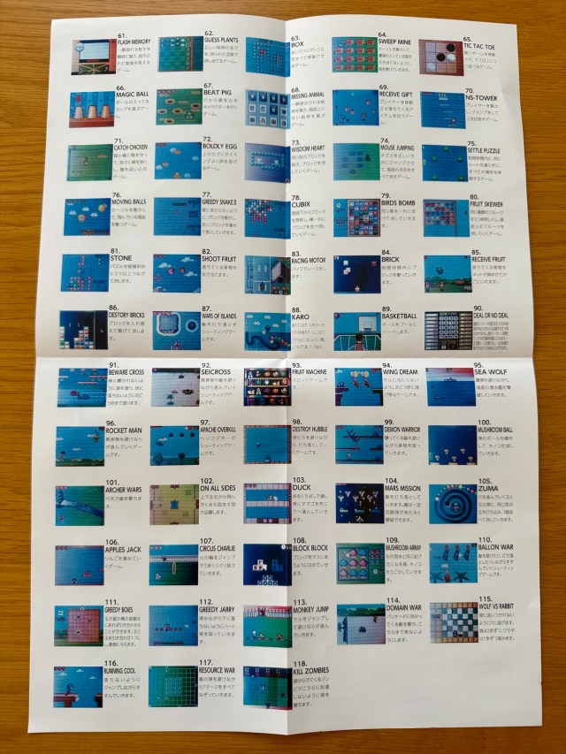 説明書にはボタン操作等の解説の他、全118種類のゲームタイトルが写真付きで載っている。んで、どうやら見覚えのあるゲームがいくつかあるようだ……