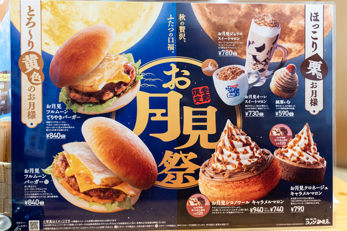 今年も始まったファストフードチェーン各社による月見戦争。コメダも9月3日から月見系メニューの提供を開始した。恒例のフルムーンバーガーもある。