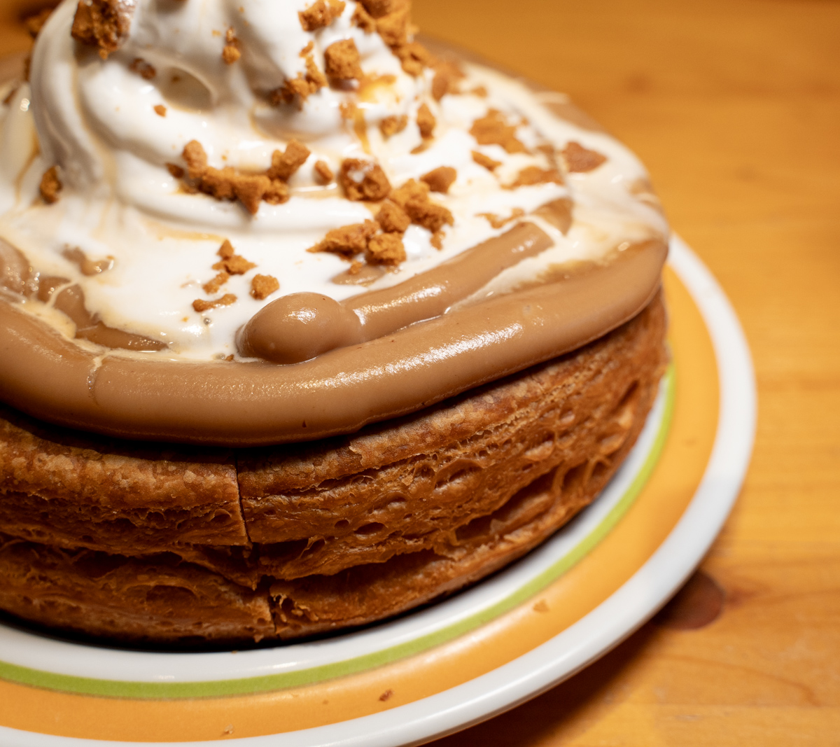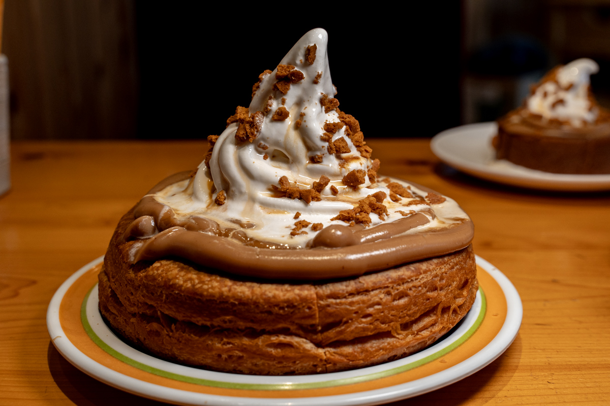まず、品とか繊細さを捨てた、量と粘度で殴るタイプのマロンクリームによるマロンフレーバー。ソフトなスポンジ生地のかわりにハードなデニッシュ生地。ソフトクリームとキャラメルソースが、これでもかと糖分をアド。
