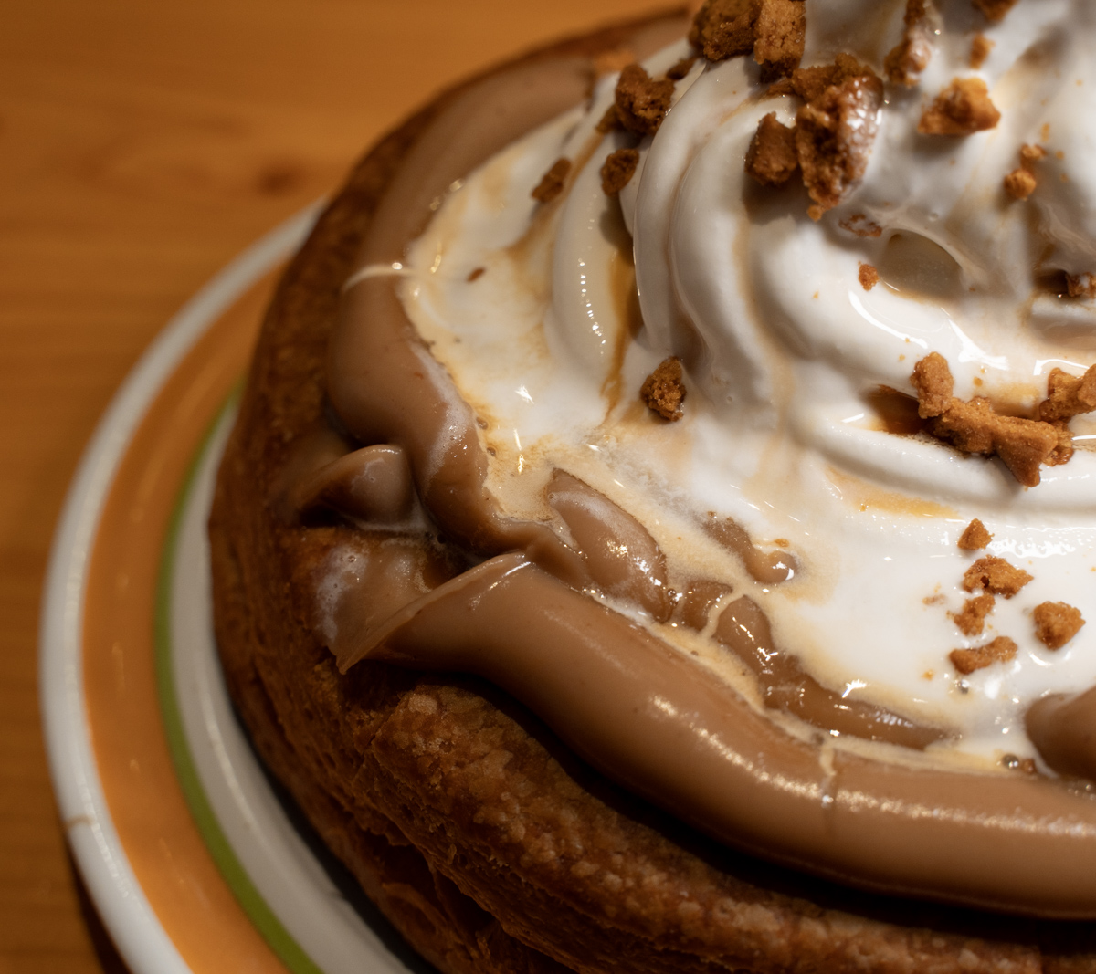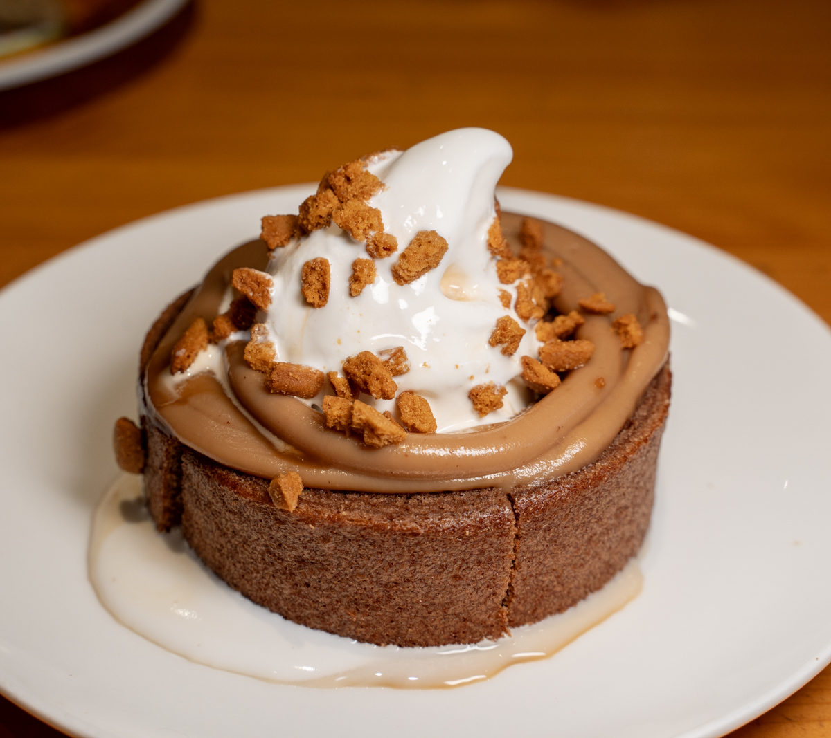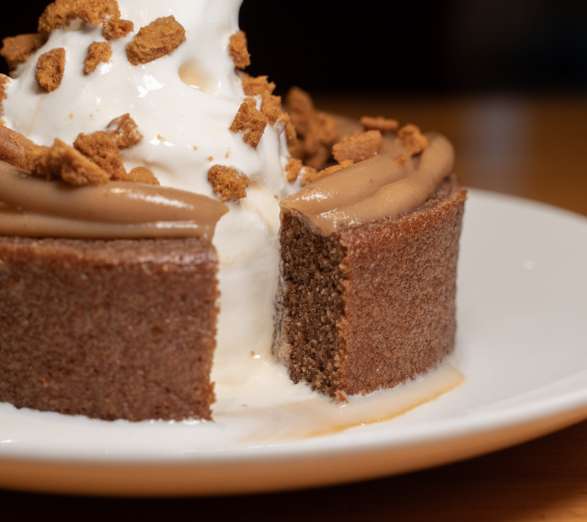 ソフトクリームはいつも通りだが、トッピングは茶色いクッキーだ。そして、ソフトクリームに混ざってわかりづらいが、キャラメルソースがかけられている。