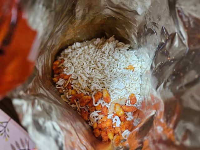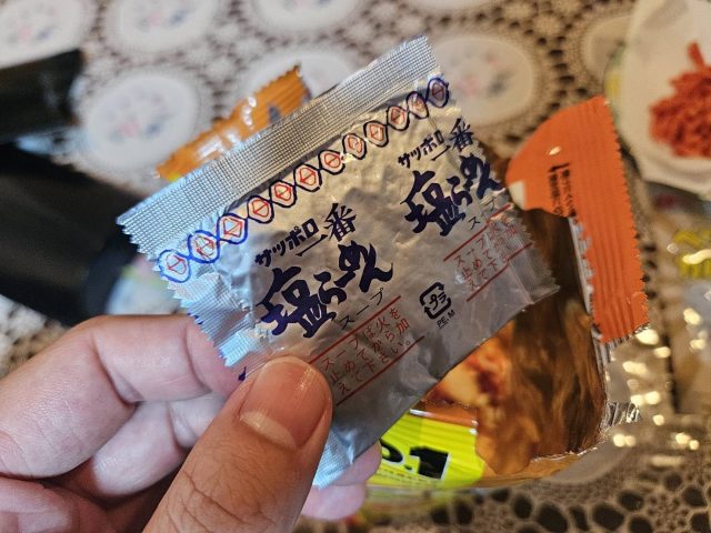袋麺も同様に砕く。本場ではTop Ramenと言う商品を使用するみたいだが、日本未発売であったのでサッポロ一番で代用。