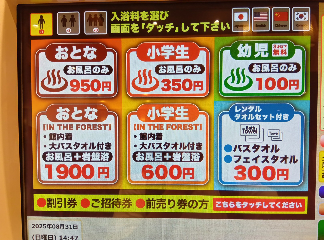 行列はなし。券売機のところも全く並んでなくて、入館チケットもスパッと購入することができた。入館料のみは950円でタオルセットをつけると1250円である。