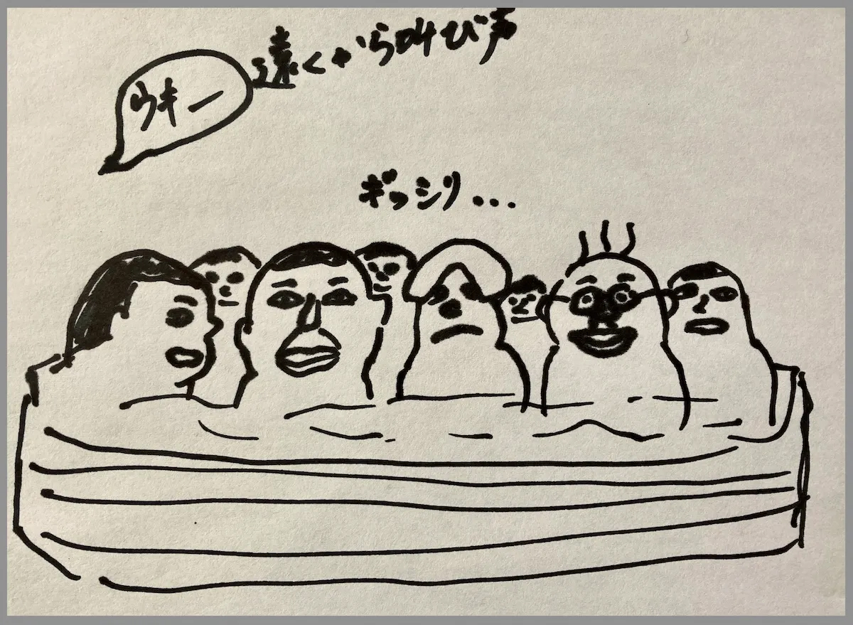 湯舟の縁に沿ってきっちり1人分ずつ敷居があるみたいに埋まっている。スペースの使い方がマンガ喫茶みたいだ。広い露天風呂ではその中を子供がゴーグルをつけて泳いでいる。嘘やろ。