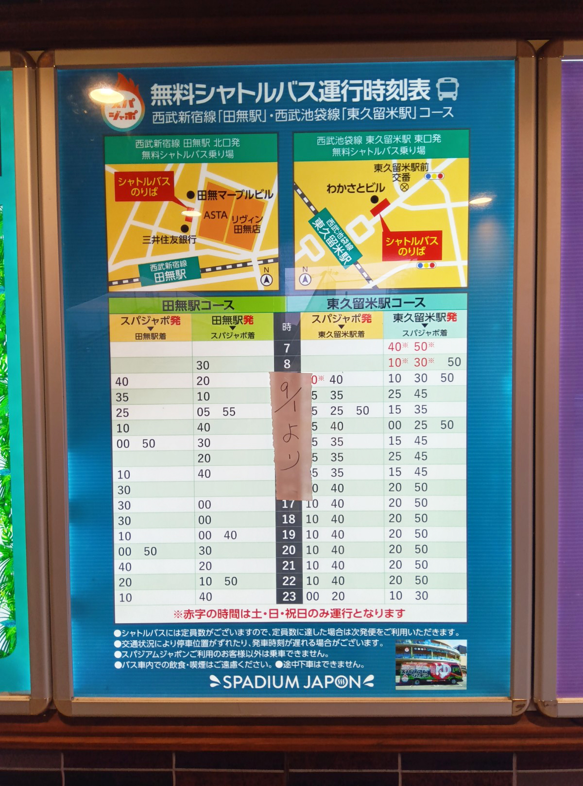 スパジアムジャポンから東久留米駅には無料のシャトルバスが出ているのだが、このスパジアムジャポン方面のバス停は西武バスのもの。ゆえに、ここから乗ると乗車料金がかかる。無料シャトルバス乗り場はこのバス停を越えた先のロータリーの外にあるのだ。