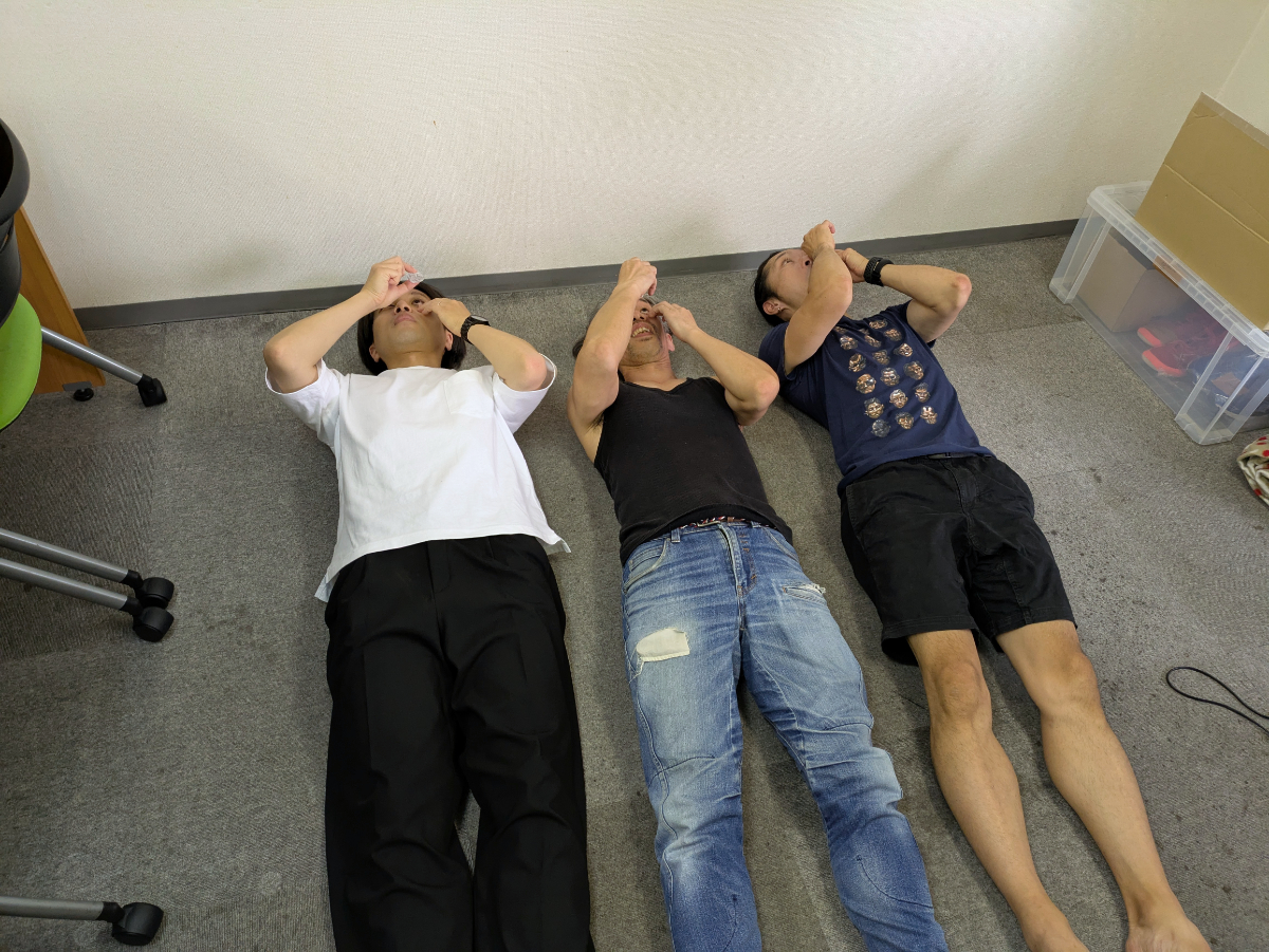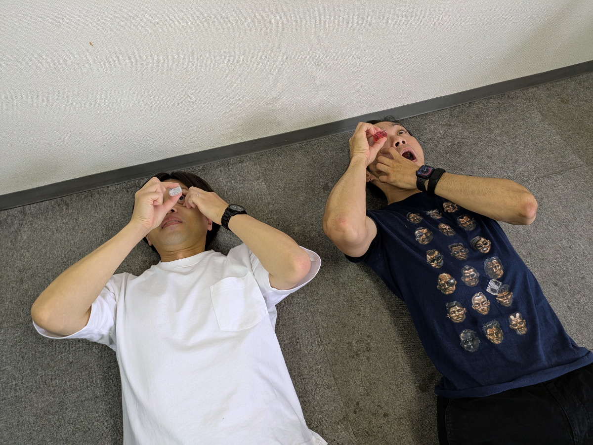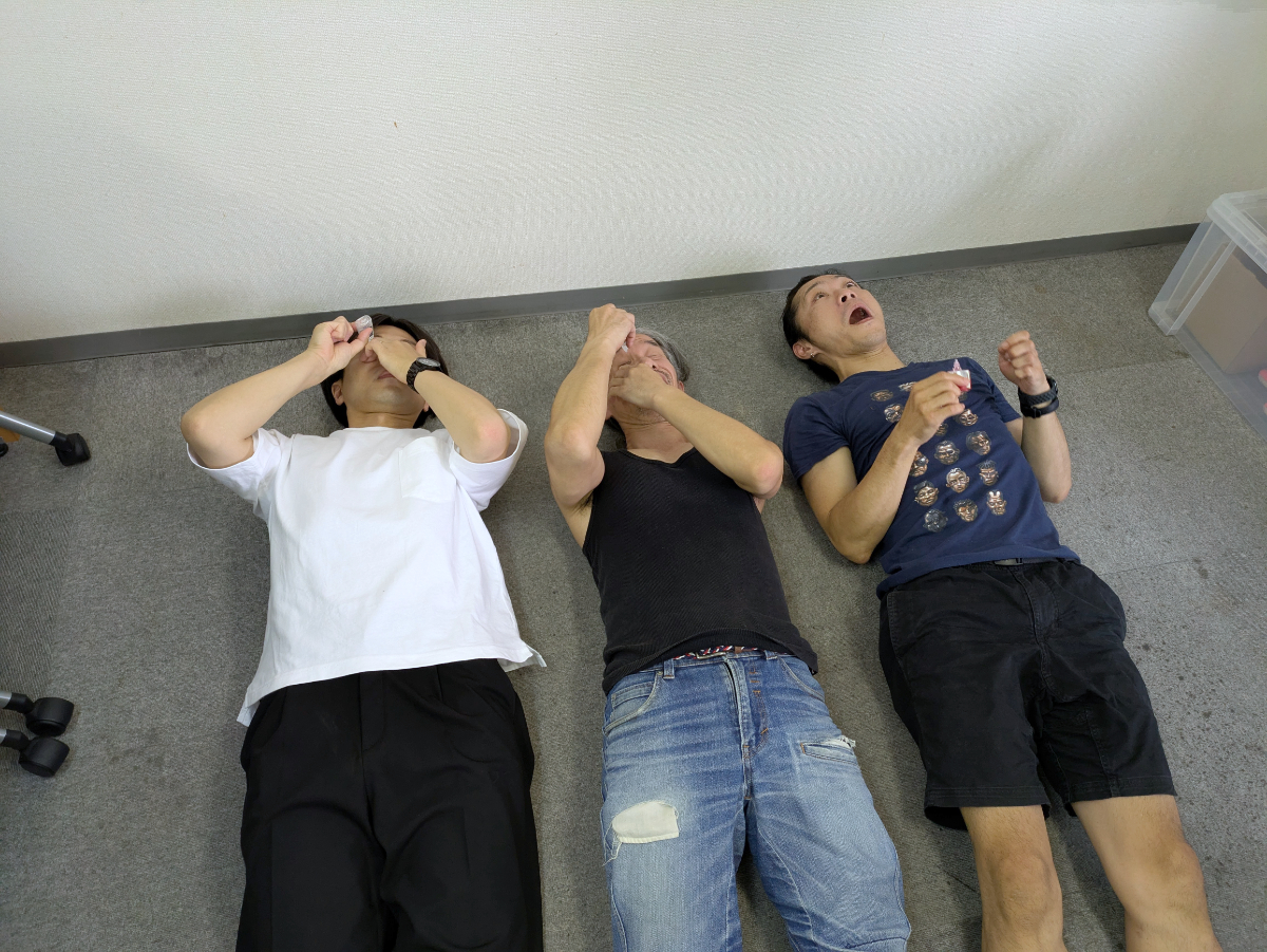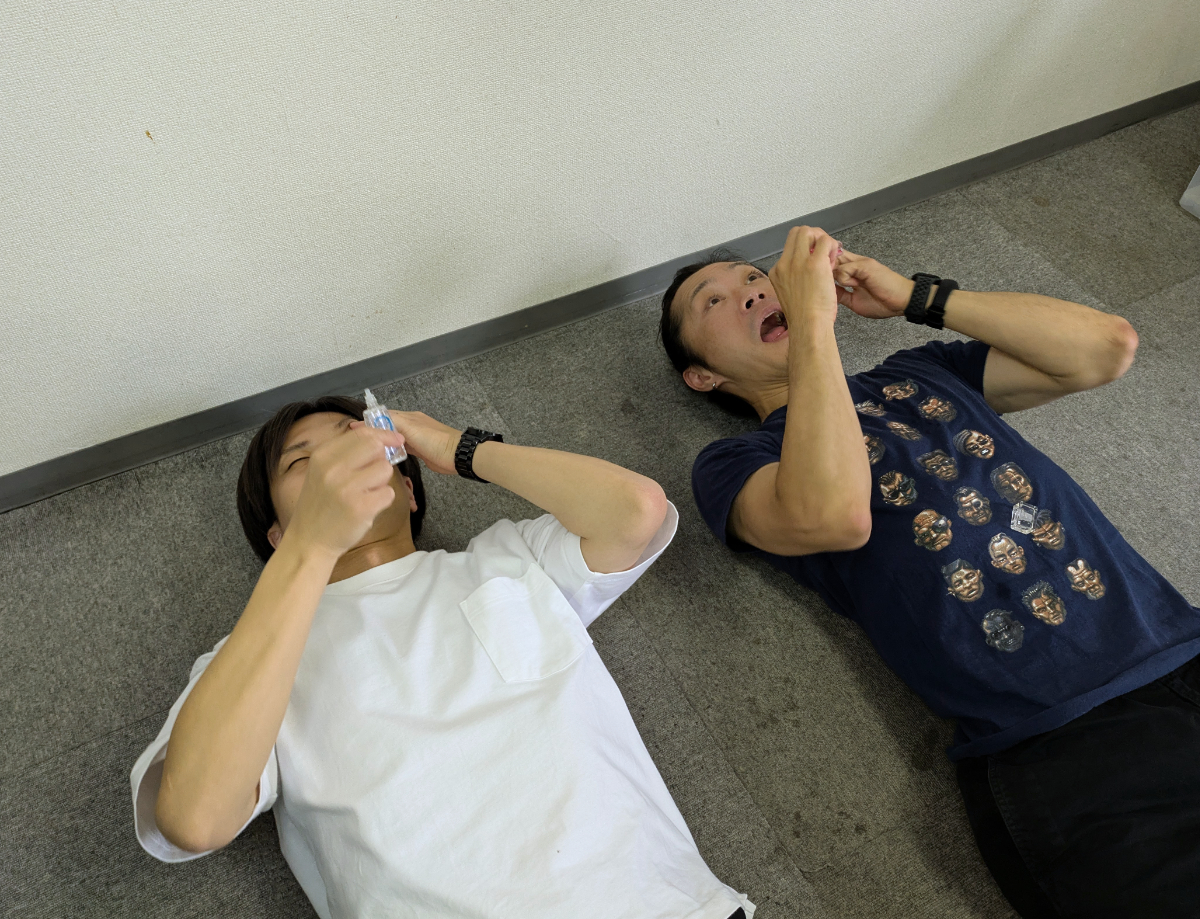 このやり方を同僚に伝えて、3人で仰向けになって目薬さしたら、何だかシュールな画になってしまった……。