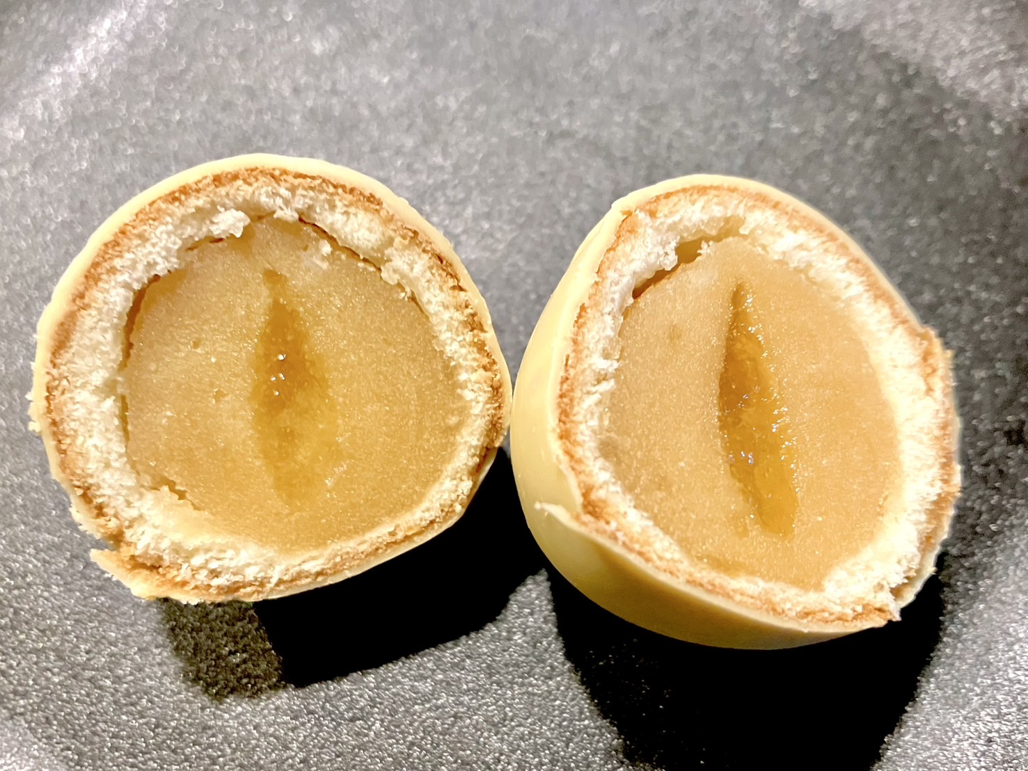 半分に切ってみると、中の餡も同じような黄色だった。中のとろっとした部分は はちみつペーストらしい。
