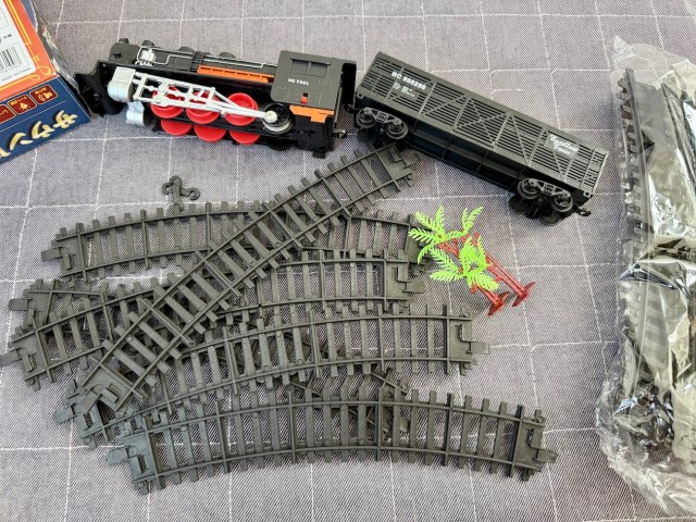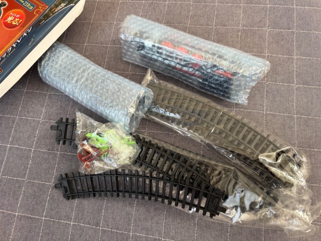 さっそく開封してみると、中には機関車と貨物車、12本のレールに加えて、南国風のヤシの木が2本。線路の直径が約1メートルで、組み立てればぐるりと円形コースになるようだ。