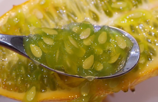 そして中から飛び出したのは、若干閲覧注意と言えるだろう。緑色のゼリーのようなぷにぷにとした果肉と種で、細長いカエルの卵のようなのだ。お世辞にもビジュが良いとは言えない。