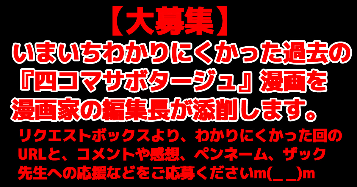 漫画家ザックKT-4先生も了承のもと、過去に掲載された『四コマサボタージュ』でイマイチよくわからなかった回を読者様からも募集したい。