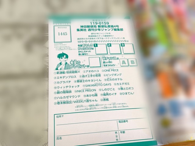 ジャンプに毎号ついてくる綴じ込みハガキ。読者が「今週面白かった作品」を3つ書いて編集部に送り、その集計結果によって本誌での掲載順や連載の継続可否が決まるのは有名な話だ。