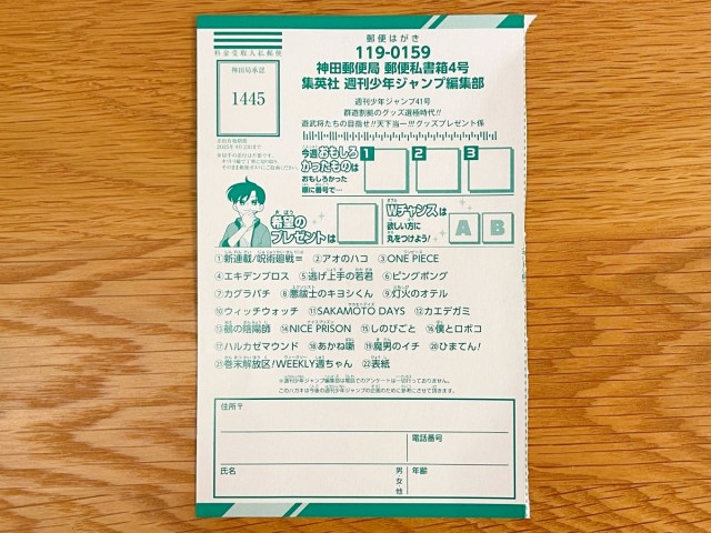 ▼というわけで実際にハガキを送ってみた。「今週おもしろかったもの」には『呪術廻戦≡(モジュロ)』と、私が愛してやまない『カグラバチ』。そして初見だが少し気になった『悪祓士のキヨシくん』を選んだ。『ONE PIECE』はもうアンケート結果とか関係ないだろう。