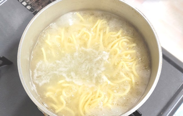 並行して、麺の方も熱湯でほぐしながら茹でる。4分半後、茹で上がった麺をざるで湯切りし、丼に入れる。