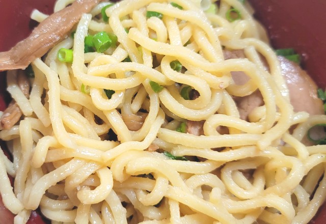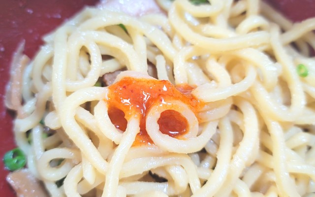 見事な仕上がりが、舌鼓を誘ってやまない。まぜそばの太麺と「こってり」の味わいが、ここまで緊密にはまるほど相性が良いとは思っていなかった。そこに着目する発想力も、それを実現させる手腕も流石である。この驚きは本商品ならではだろう。
