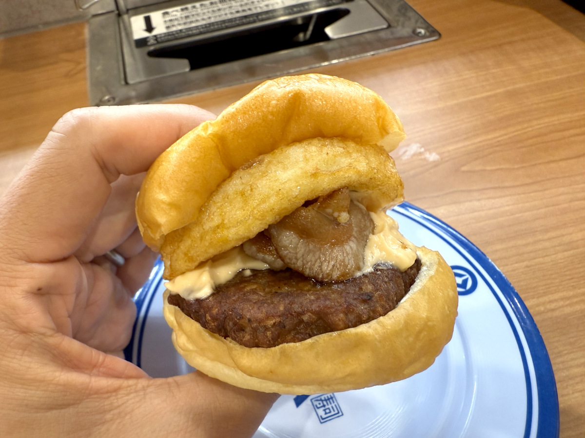 で、さっそく最寄りのくら寿司で「くら月見バーガー」をオーダー。通常の握り寿司よりだいぶ時間はかかったが、しっかりオーダーを受けてから作っていることなのだろう。ただ見た瞬間の感想は……