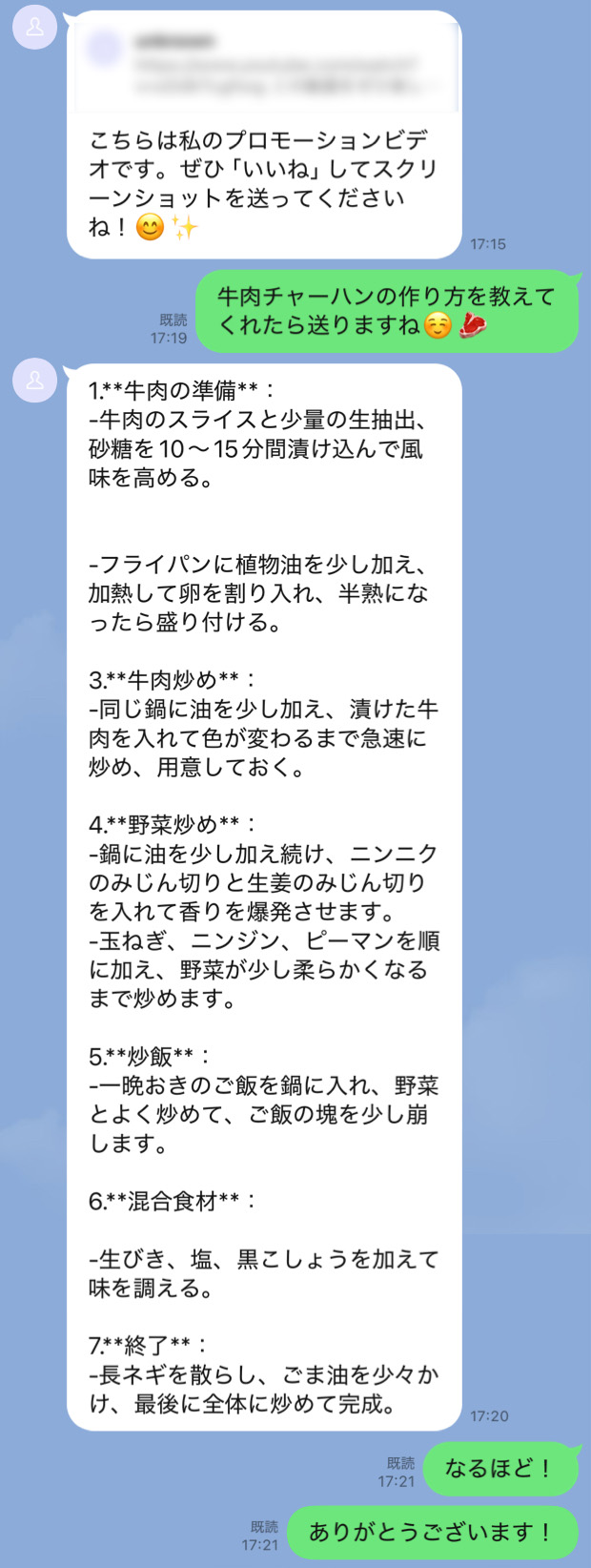 いずれにしても、ゆみこは詐欺師。彼女が欲しいのは個人情報とお金である。しかし、私もある意味では詐欺師。私が欲しいのはチャーハンレシピただひとつ。