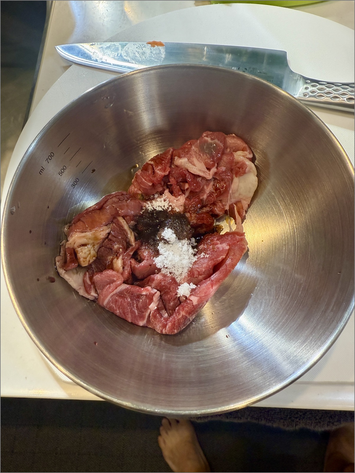 牛肉スライスに少量の醤油と砂糖を10〜15分間漬け込んで風味を高める。
