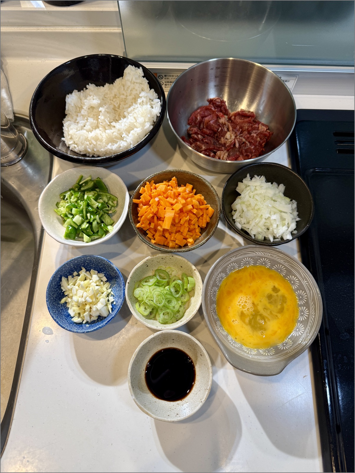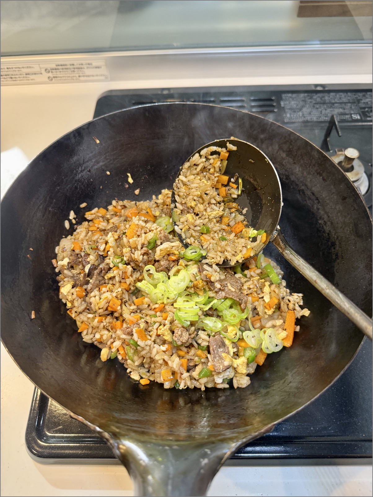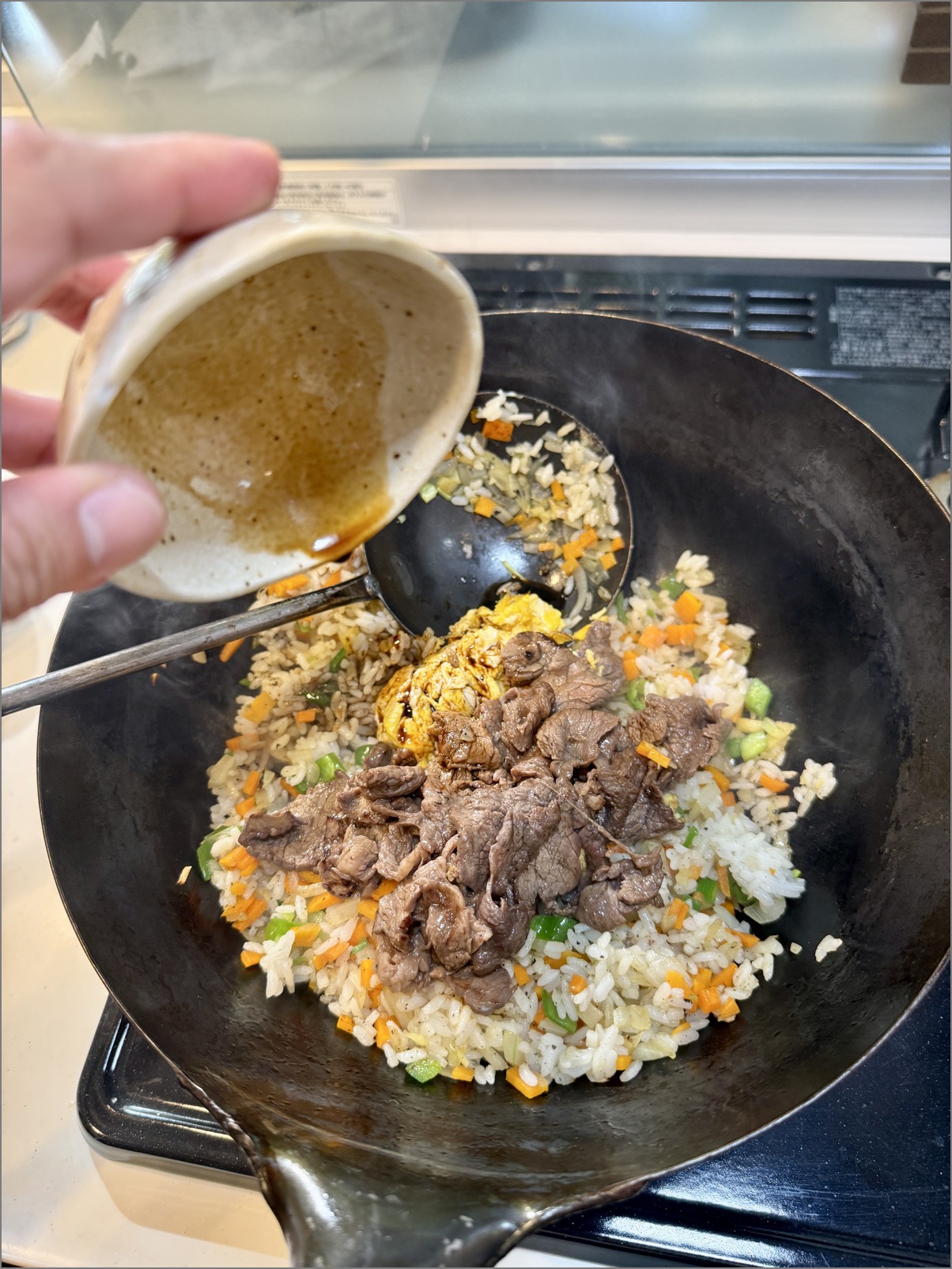 炒めておいた牛肉、卵も追加し、醤油と塩コショーも加え、味を整えながら炒め続ける。