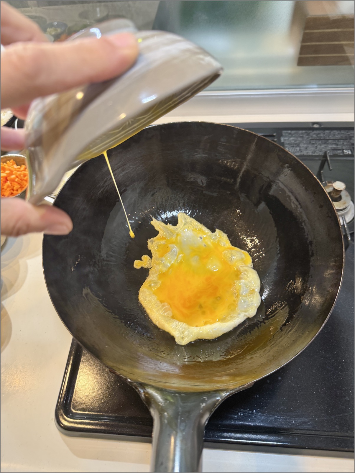中華鍋にサラダ油を少し加え、加熱して溶き卵を入れ、半熟になったら取り出しておく。