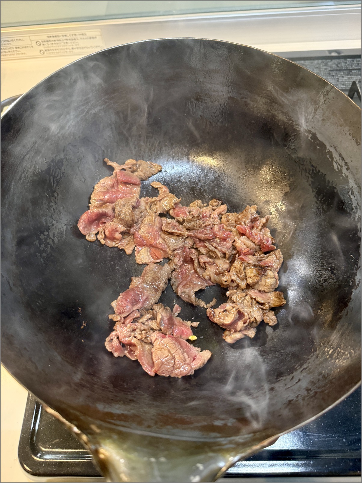 同じ鍋に油を少し加え、漬けておいた牛肉を入れ、色が変わるまで炒め、取り出しておく。