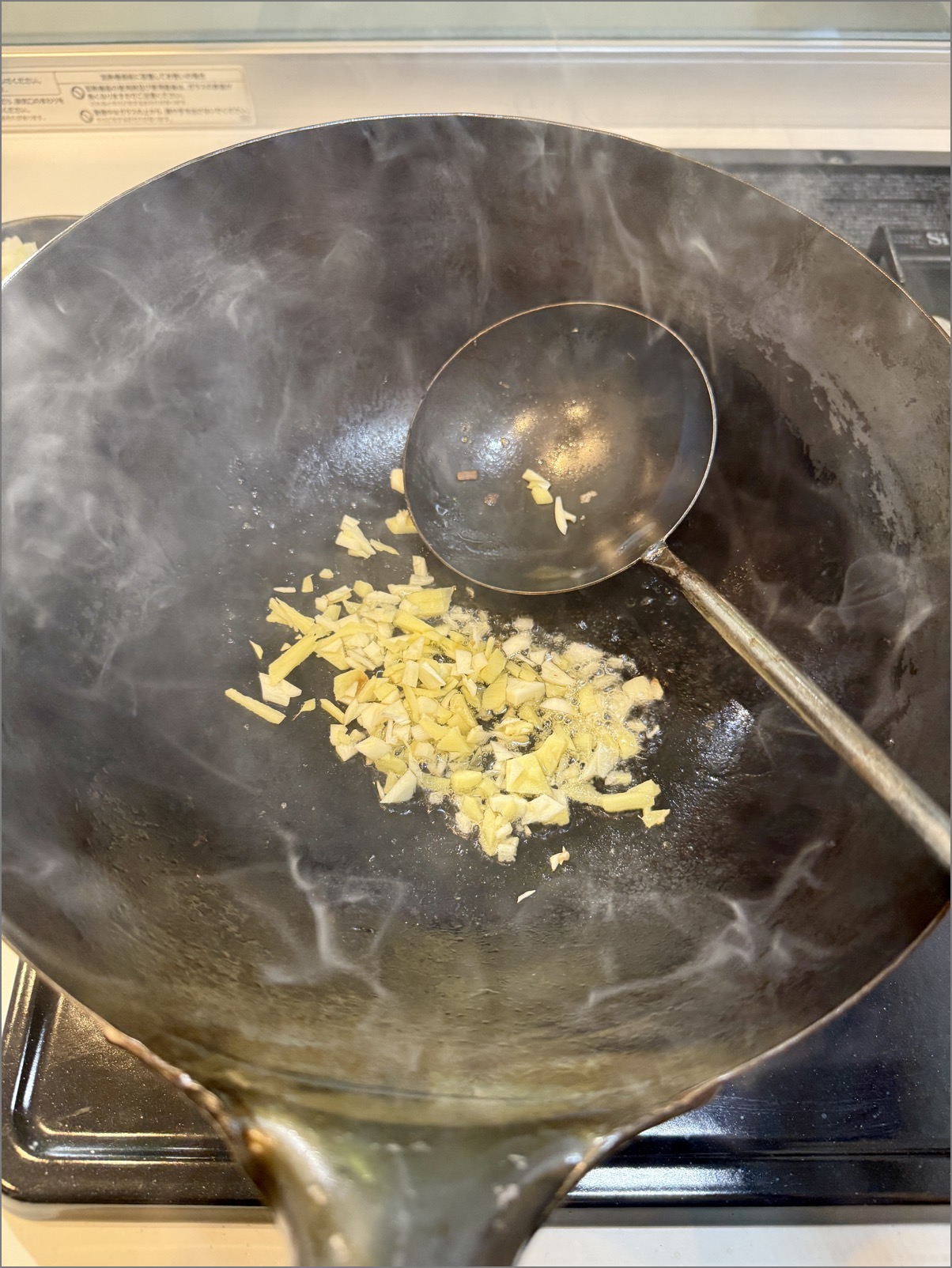 鍋に油を少し加え、ニンニクのみじん切りと生姜のみじん切りを入れ、香りを爆発させる。