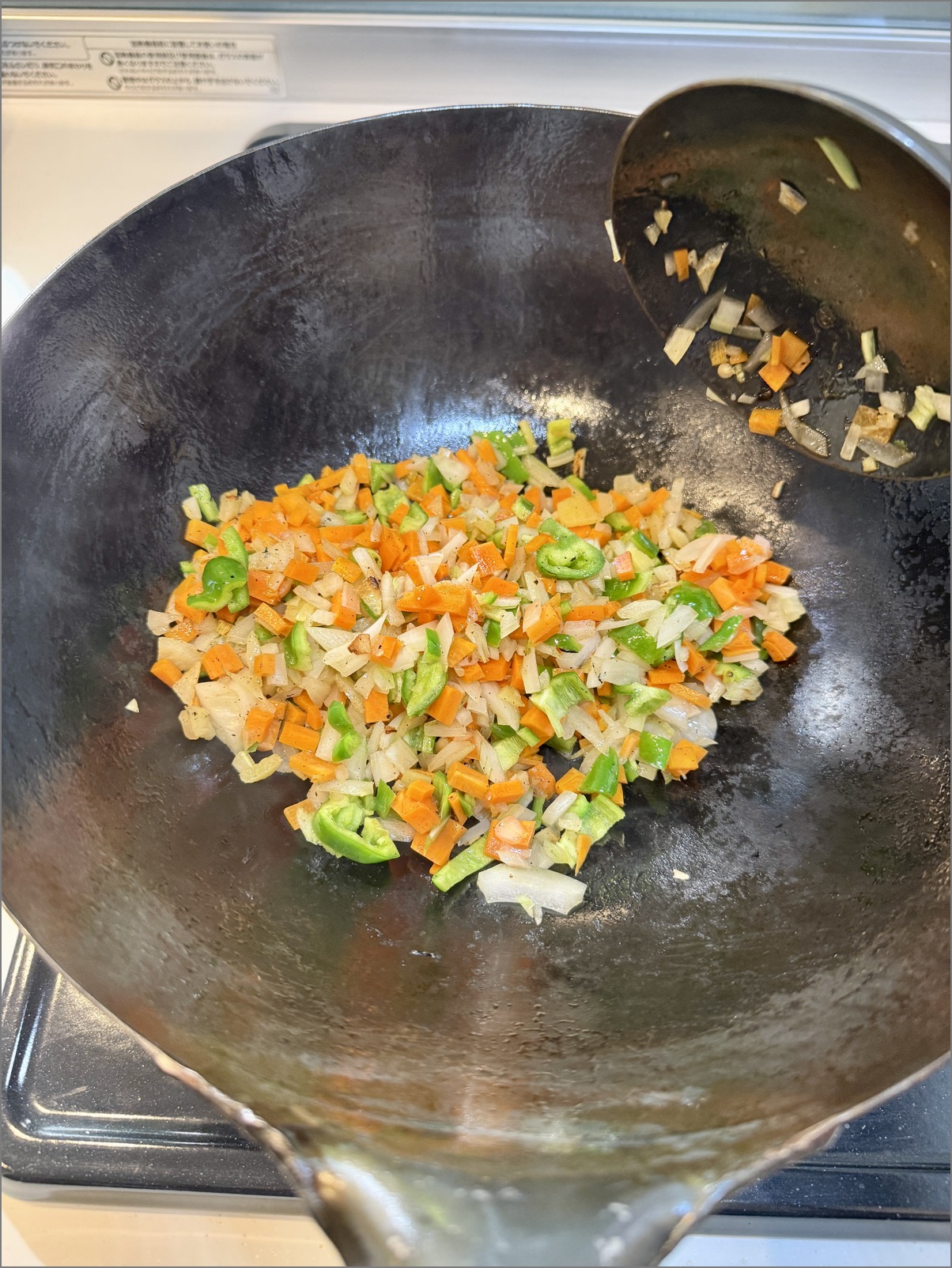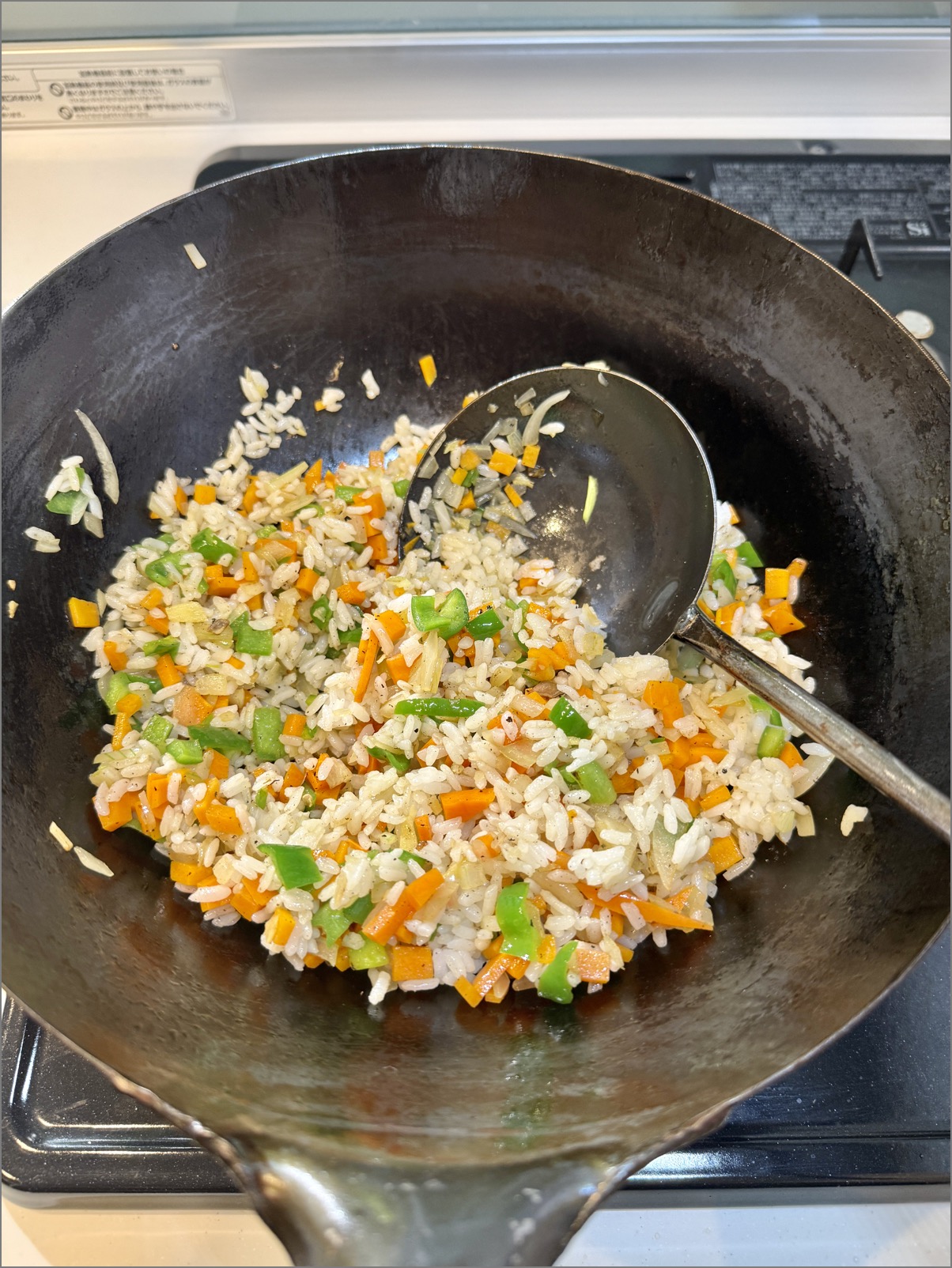 一晩おきのご飯(冷やご飯)を中華鍋に入れ、ご飯の塊を崩しながら野菜と混ぜ炒める。