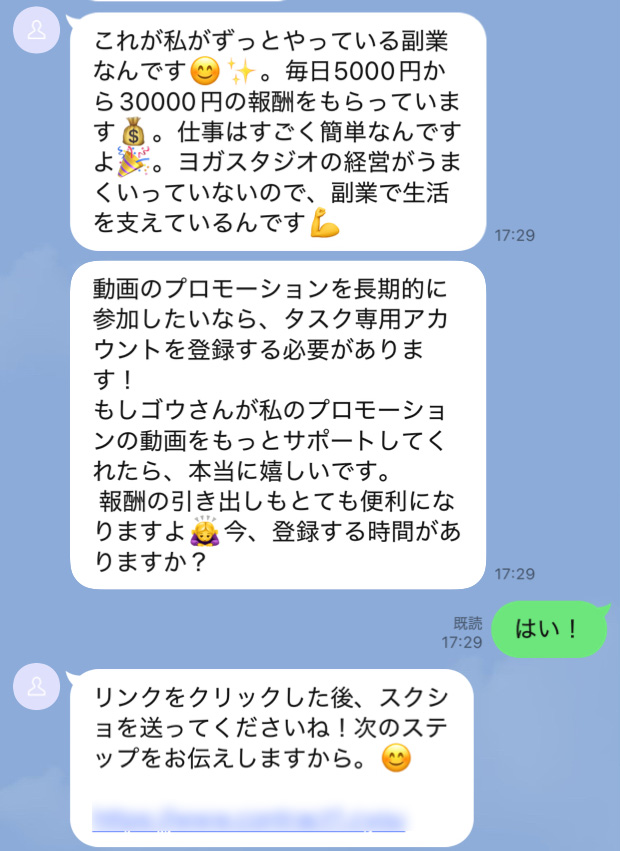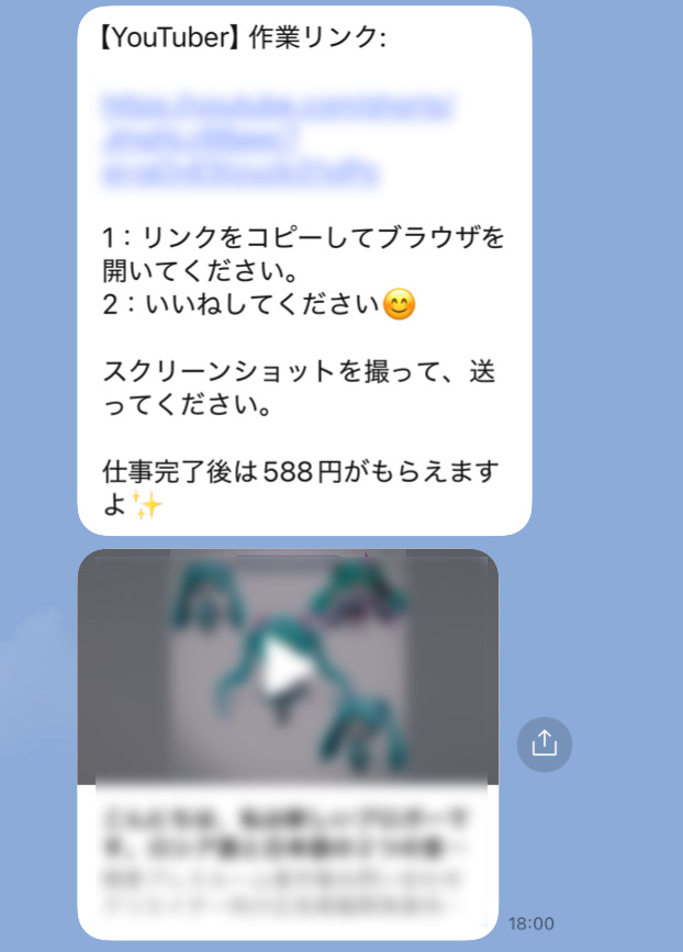 相手から依頼される副業の中身は超簡単。YouTube動画に「いいね」を押して、スクショを撮って送るだけ。それだけで大儲けできる……らしいが、これは完全にウソである。