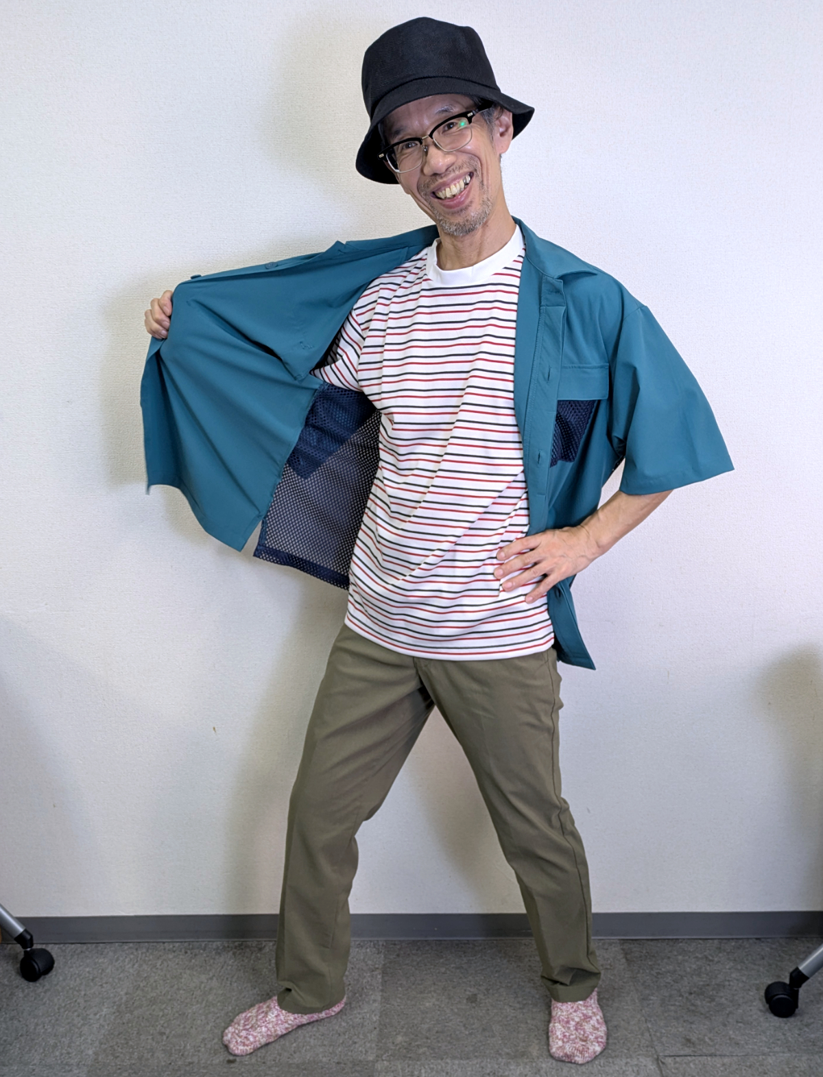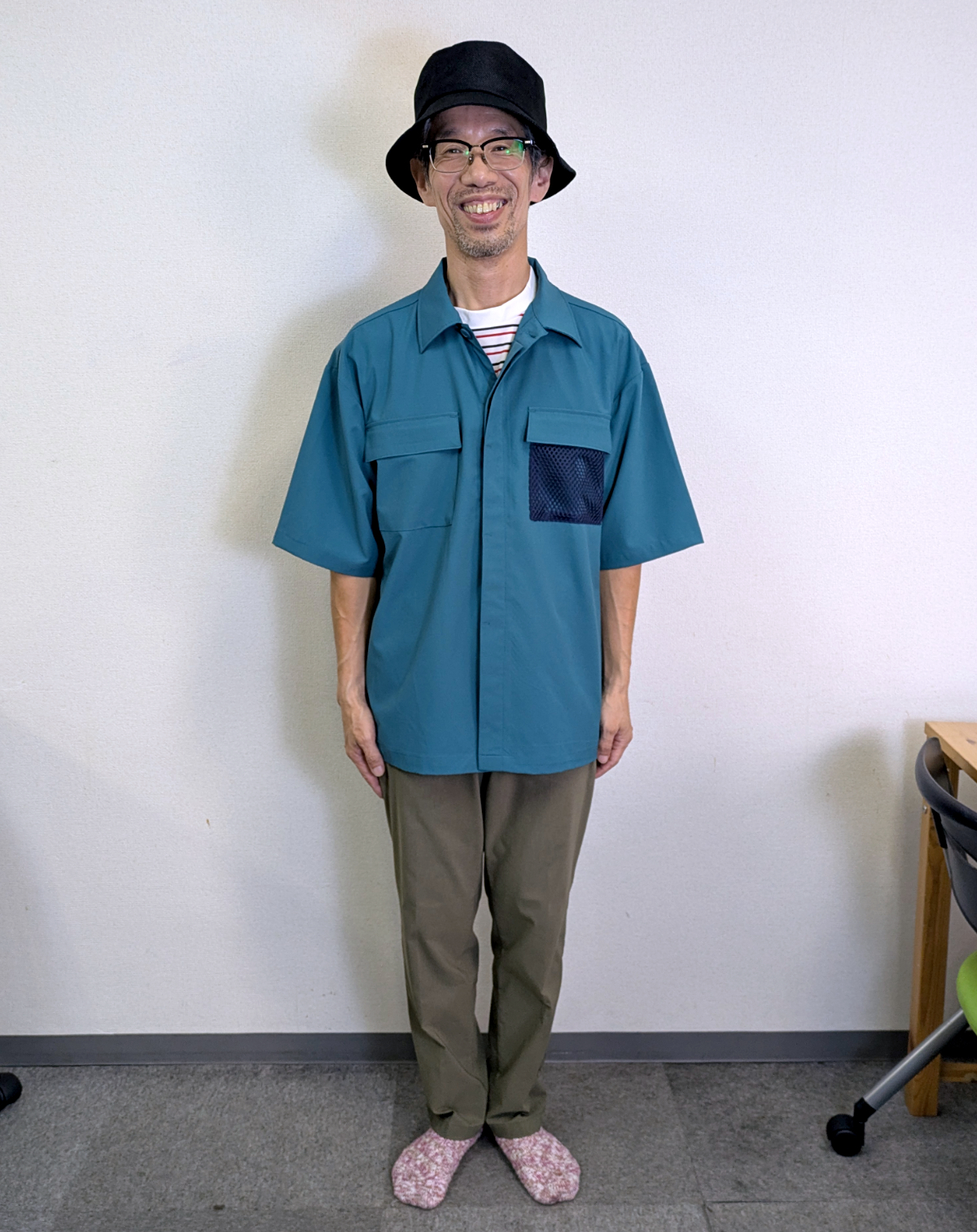 改めて画像で詳しくお見せしよう。私はベージュのスラックスに、コバルトブルーの半袖シャツを合わせた。半袖はロゴスのファミリーブランド「ロゴスパーク」のものだ。