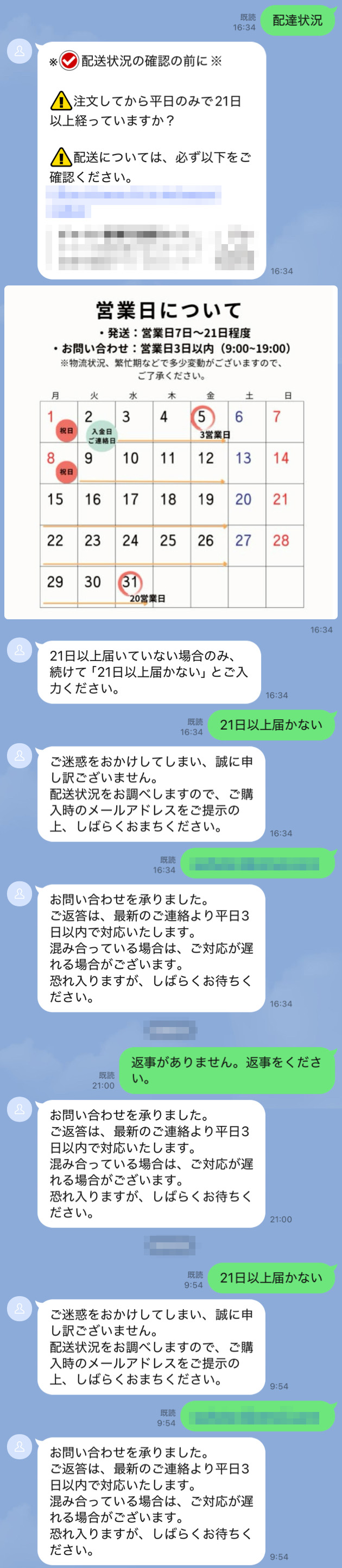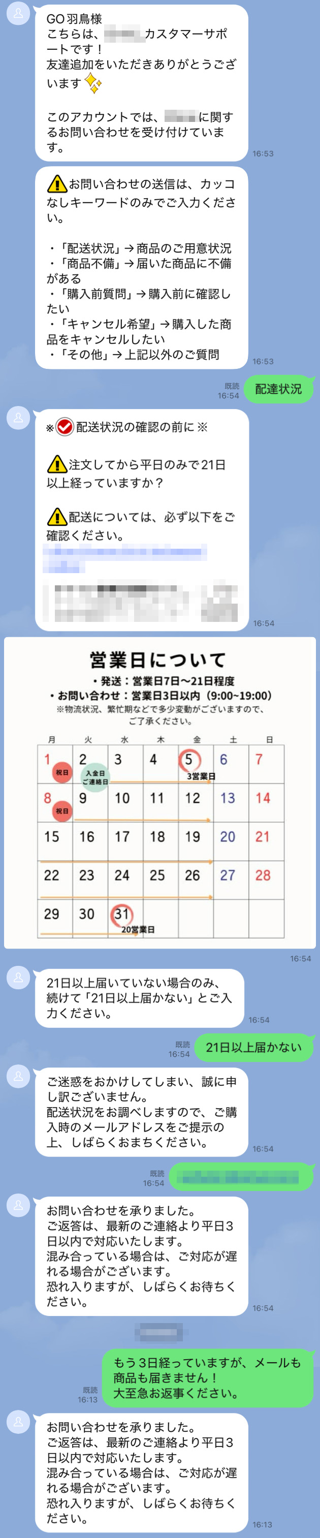 7日〜21日営業日で届くとの案内だったので期間内はおとなしく待機。そして22日目、私はお問い合わせをすることにした。問い合わせの方法はLINEだった。