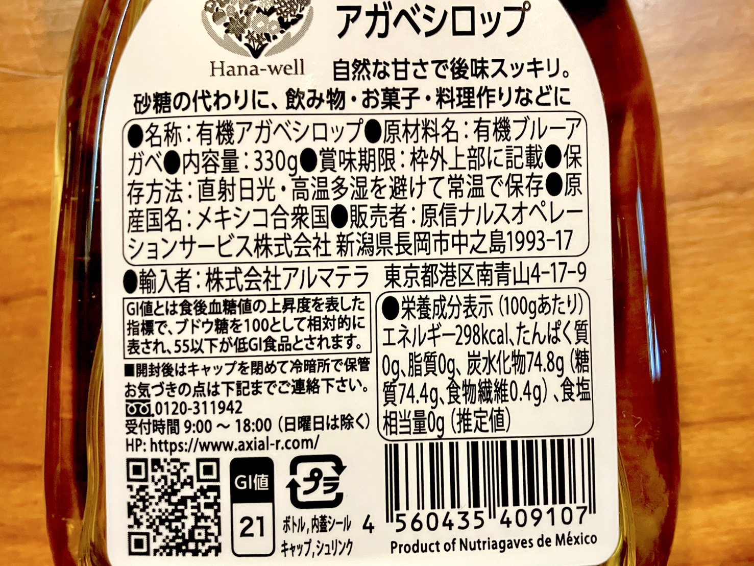 こちらが今回購入した「アガベシロップ」。新潟県のローカルスーパー「原信」で販売されていた商品で、価格は税抜き498円だった。