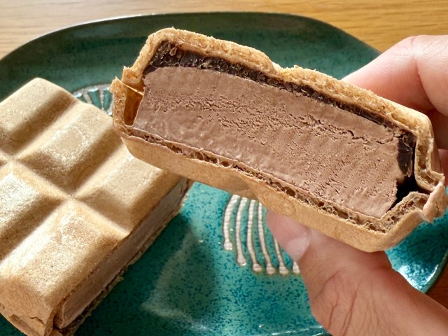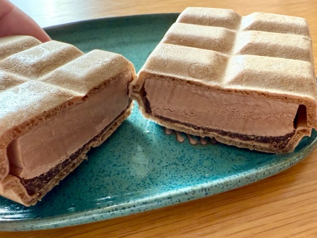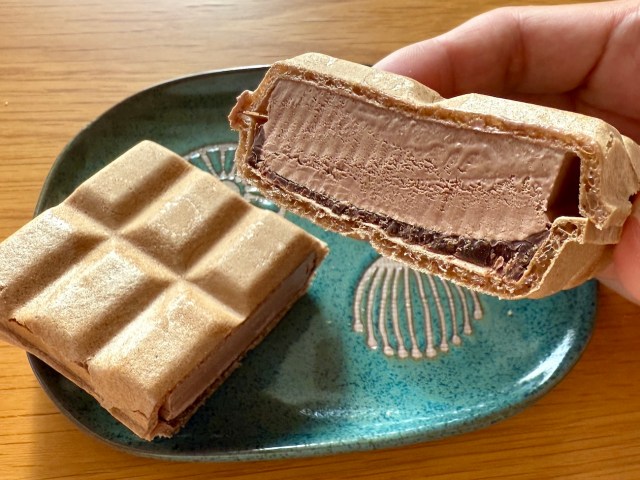 食べてみると……もっとヤバい。ひと口ごとにモナカのザクっとした歯ごたえと、クランチ入りチョコのパキパキ感が押し寄せる。その直後に広がるのは、高級感あふれるチョコレートの濃厚な甘さ。