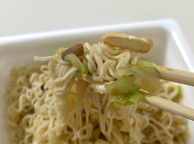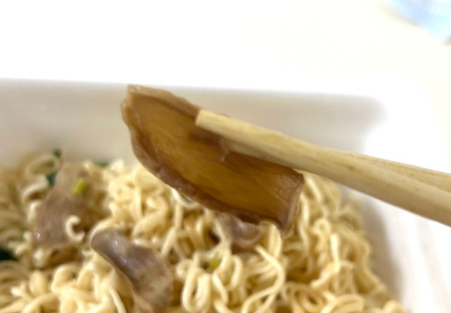麺に絡みついた松茸が、こぼれ落ちそうになるほど豊富に入っている。そして松茸はインスタント食品で体験したことのない、深みのある松茸の風味と独特の食感。香料では再現できない、本物の松茸ならではの味わいが口の中に広がる。