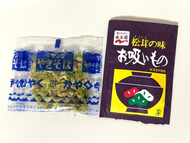 そこで購入したのは、通常の「ペヤングソース焼きそば」と「永谷園のお吸いもの(松茸の味)」だ。