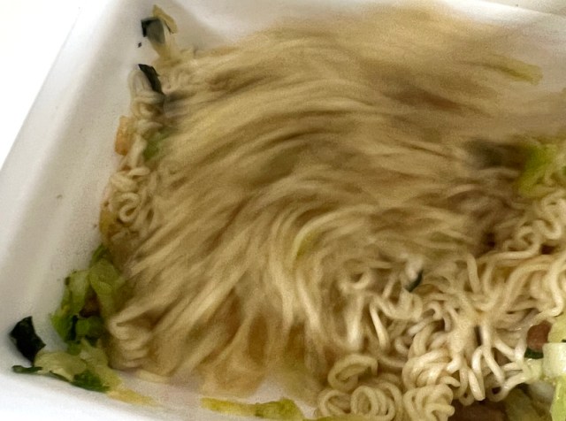 また最後に待っている、ペヤング好きなら誰もが知っている「ゴールデンタイム」。食べ進めて量が少なくなると、ソースと具が底に溜まり、味が凝縮される瞬間だ。この最後の一口で、真価が問われることも多い。