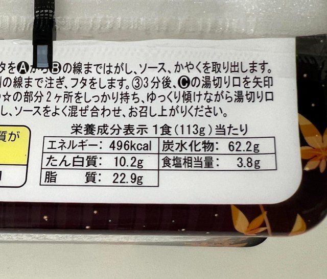 まず「栄養成分表示」に目を向けると、決して低カロリーとは言えないが、通常の「ペヤングソース焼きそば」に比べれば、496kcal、脂質22.9gとややヘルシーな数値である。