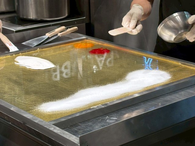 途中、壁のフックを使ってキャンディを伸ばしたり、空気を含ませて食感を調整したり。その過程を見ているだけでワクワクが止まらない。
