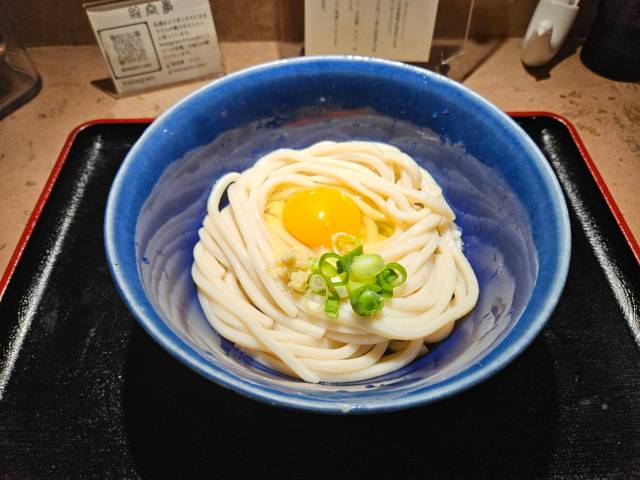人気No.1は肉うどんとのことだが、初の玄米うどんなのでダイレクトに麺が楽しめそうな「釜玉うどん。(税込640円)」を注文してみた。
