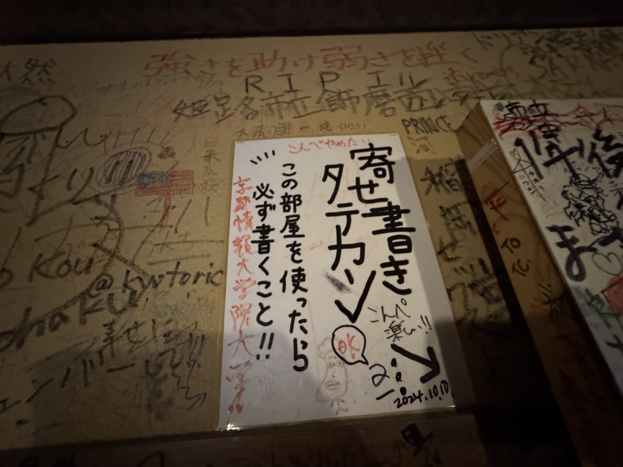 正確には落書きではなく「寄せ書き」のようだ。部屋にはペンが設置されており、私にも寄せ書きをする権利があるのかもしれなかったが、京大生の部屋に見合うハイセンスな寄せ書きが思いつかず今回は遠慮させていただきました。