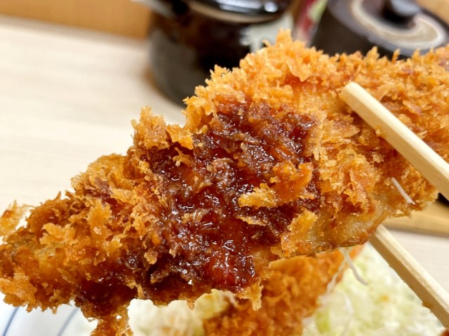 ソースかと思いきや、かかっているのは牡蠣醤油を使用した甘辛い特製タレ。どうやら定食とは仕様が違うらしい。で、これがまた丼らしく、ご飯加速装置の役割を果たしまくっている。要はめちゃウマだ。