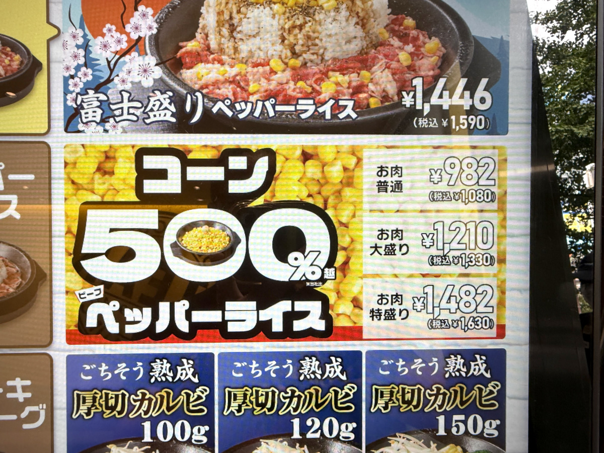 なお、今回はベーシックな『コーン500%ペッパーライス(1080円)』を注文したが、「お肉大盛りコーン500%ペッパーライス(1330円)」と「お肉特盛りコーン500%ペッパーライス(1630円)」もラインナップされている。