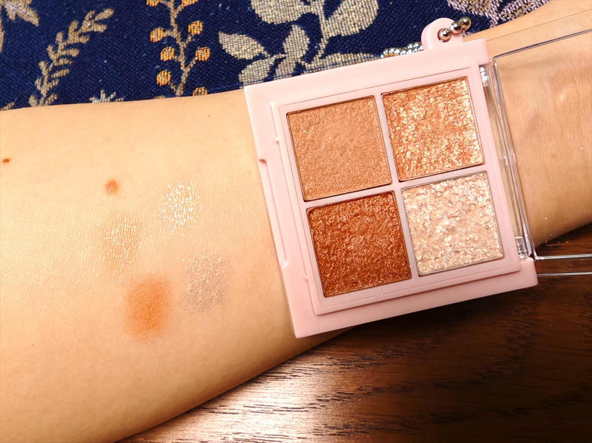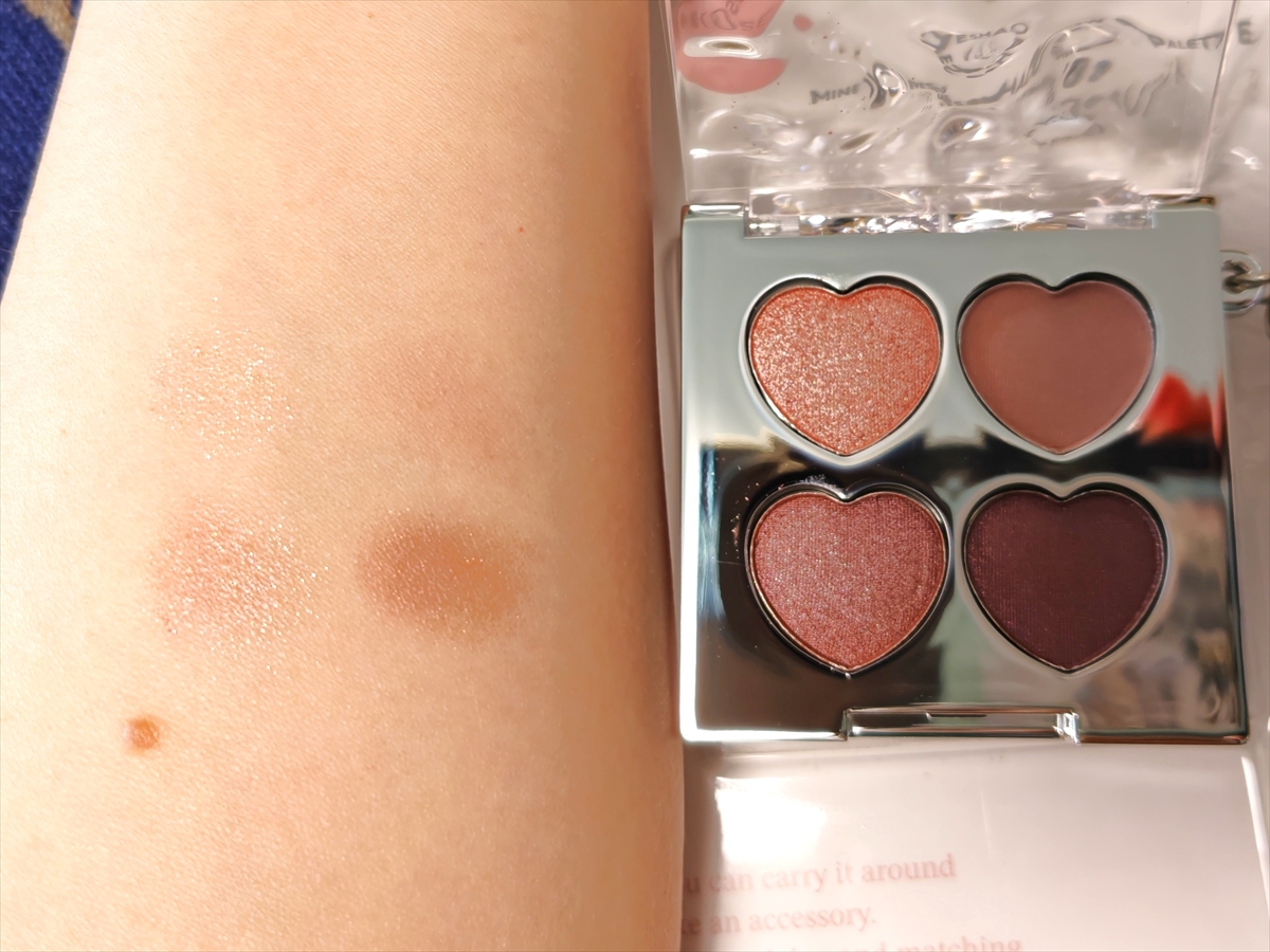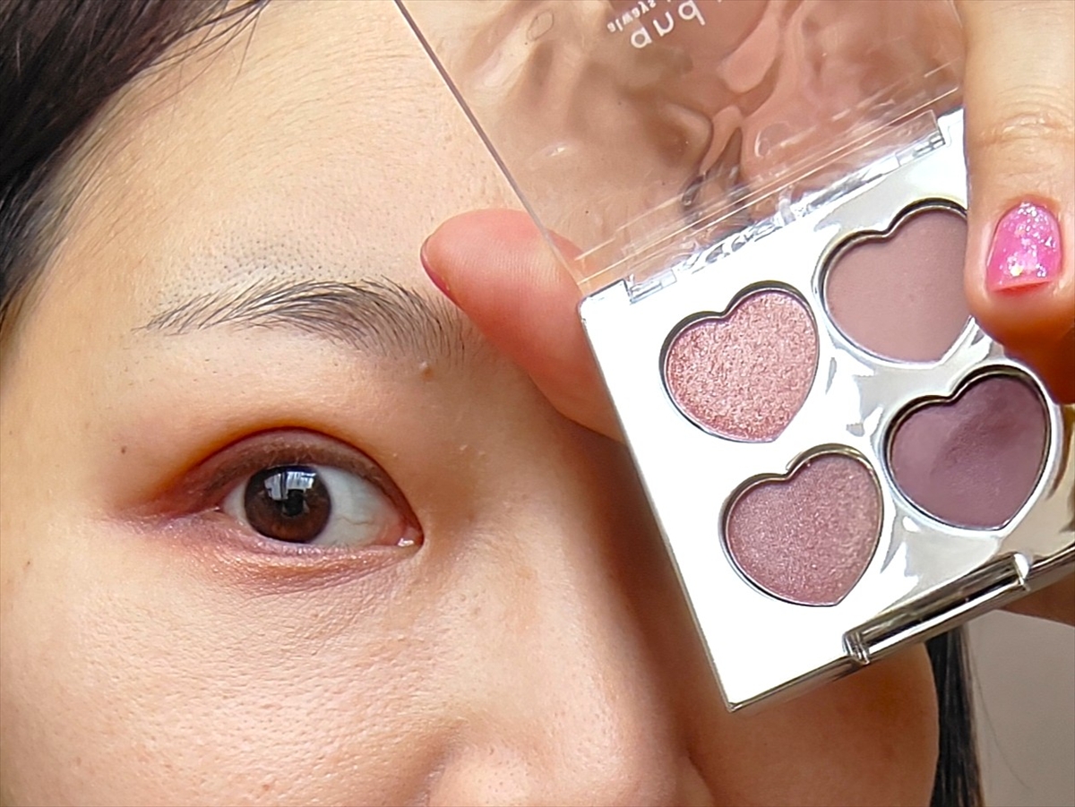 ダイソーと同じく4色セットだが、シャドウの形がハートになっていたり ケースがミラー素材だったりと細部までオシャレ。発色は控えめで、くすみ感のあるカラーが今っぽい印象だ。