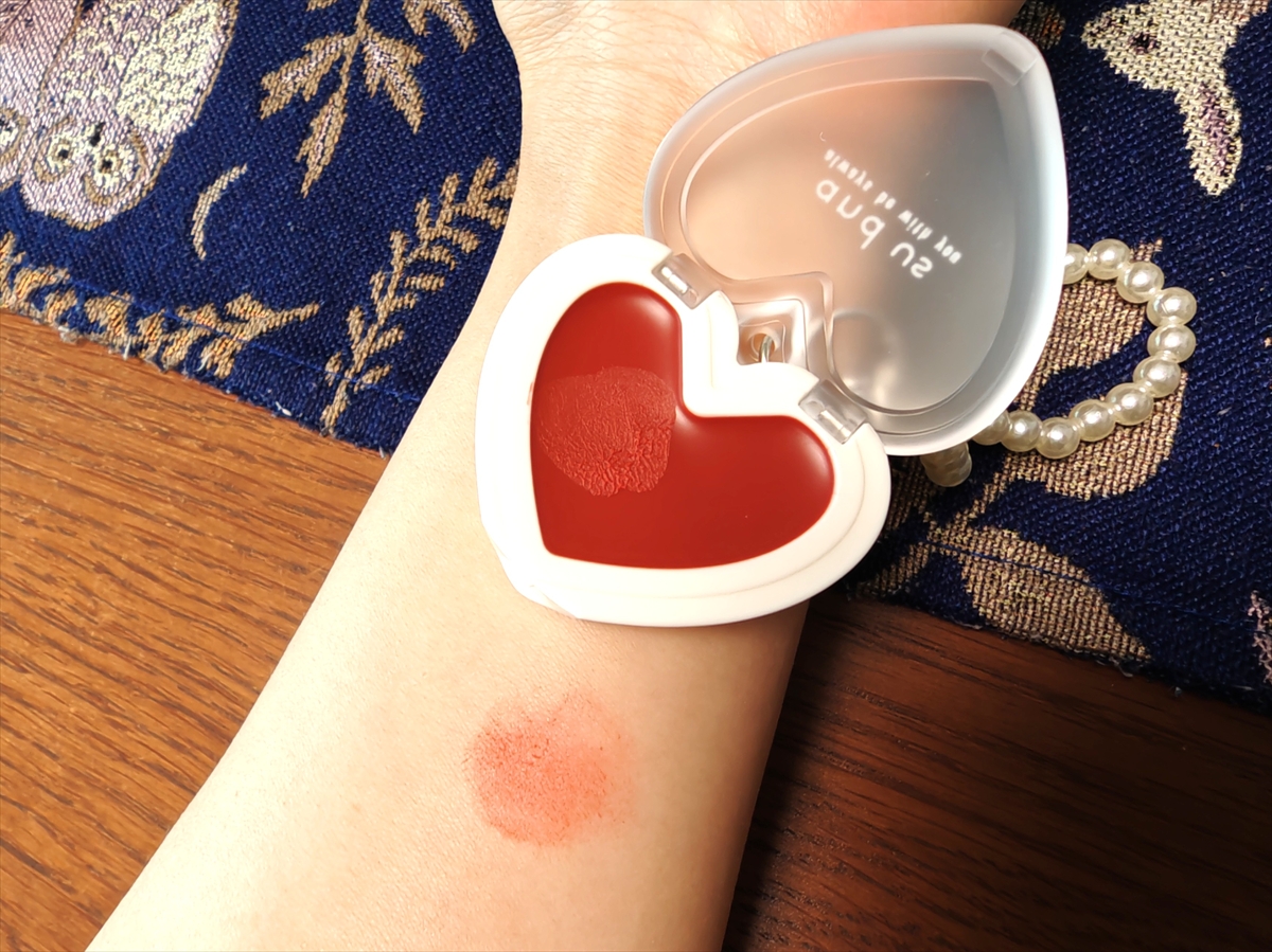フワッとマットな質感で、指でトントンと広げると血色感のあるメイクができる。色持ちはボチボチだが、デザインがとにかく可愛いので万人にオススメしたい。