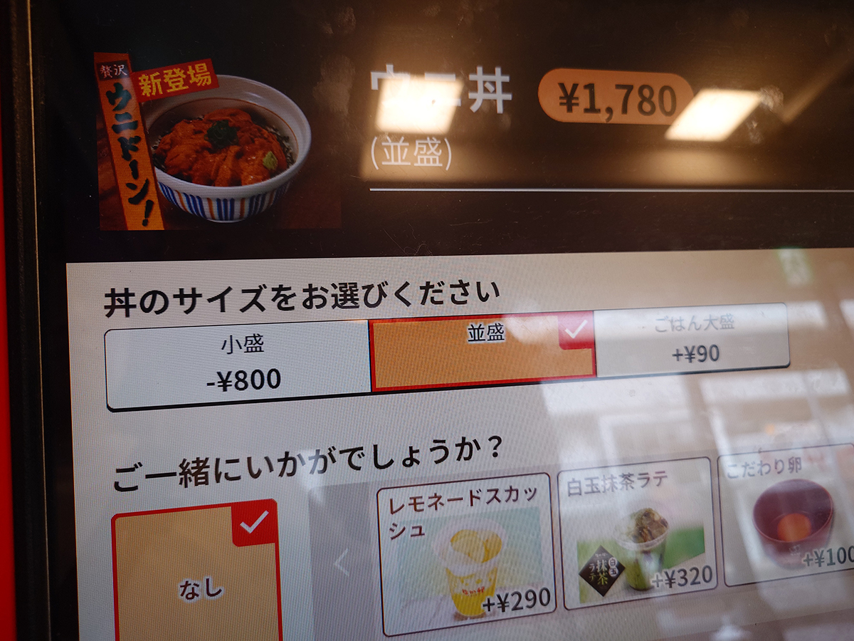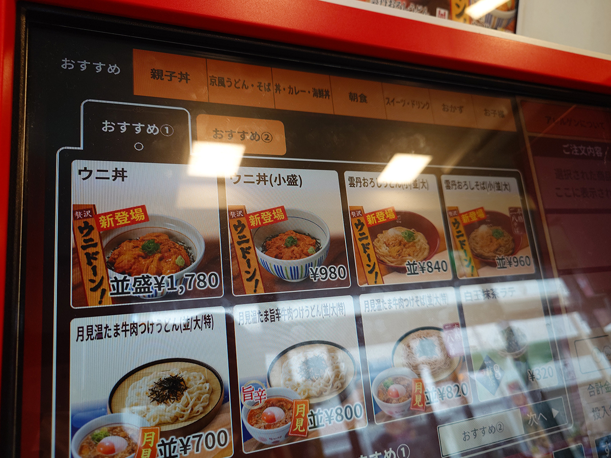 ということで、初日の夜に最寄りの なか卯へ。ちょうど夕食時で、店内は混んでいる。テイクアウト待ちも結構いるぞ。ウニ丼っぽいのを食べてる者もいる。