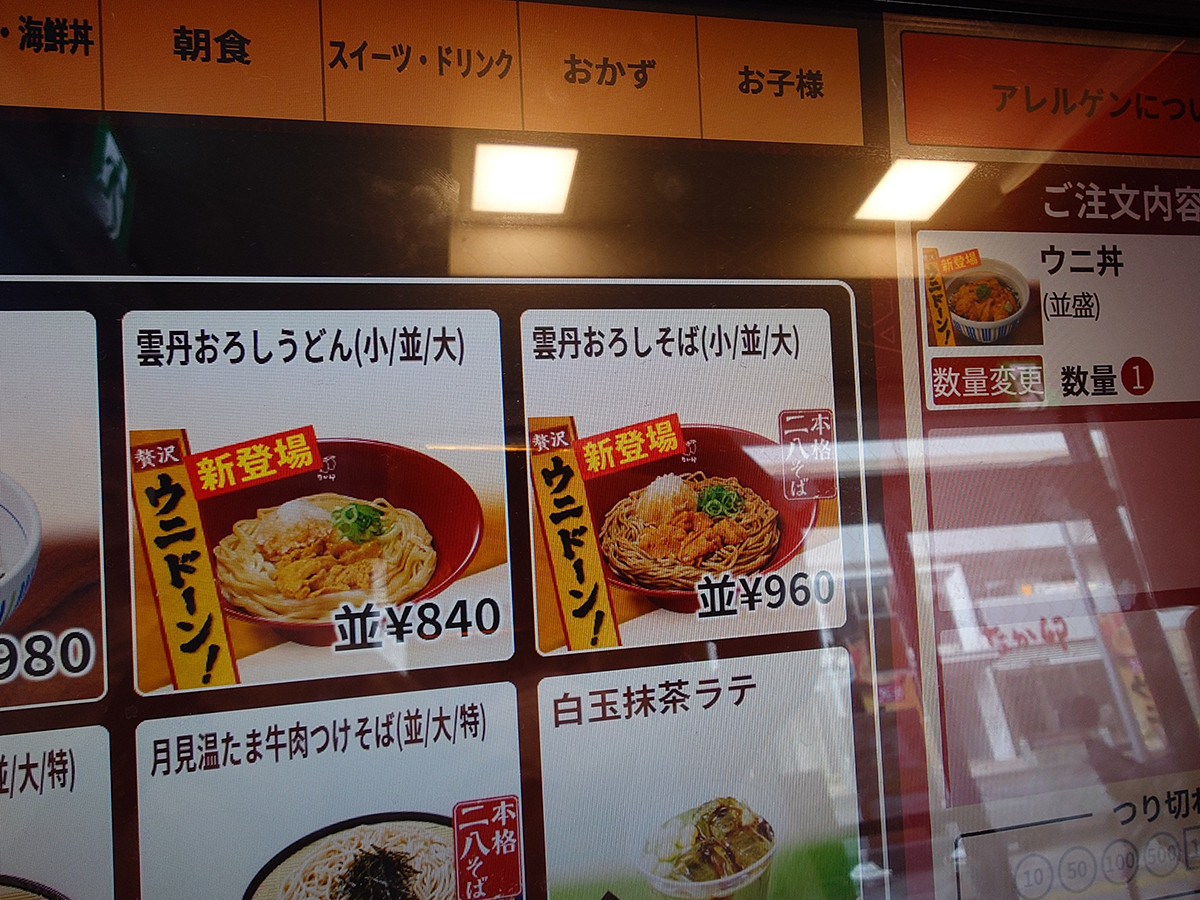そしてうどんは……おっと? 蕎麦もあるのか。うどんは普通にウニと合いそう。なんとなく想像がつく。しかし、蕎麦もやれるのか……?