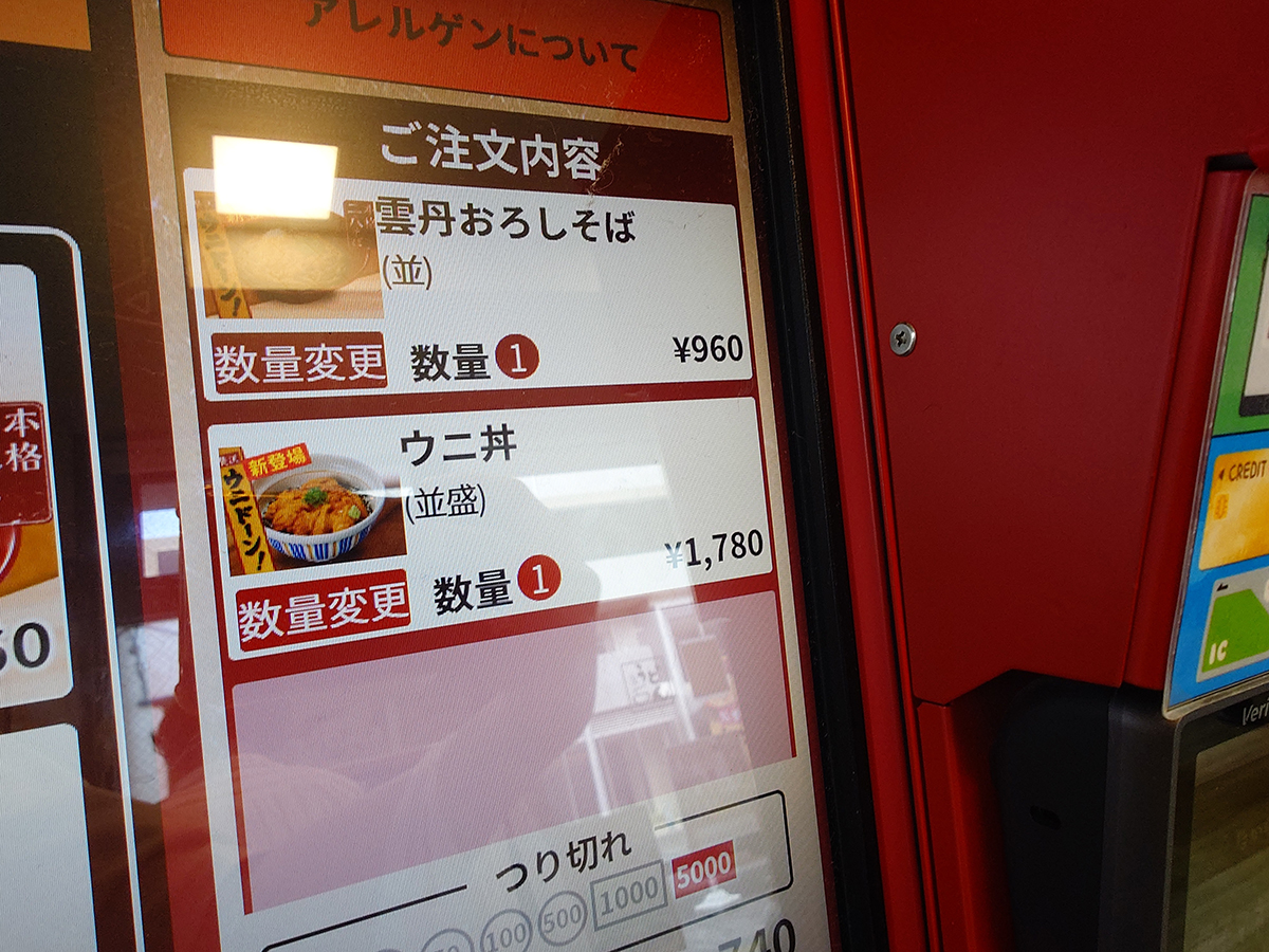 面白そうだったので、今回は蕎麦を選択。合計で2740円。なか卯でこんなに金を使うとは思っていなかった。