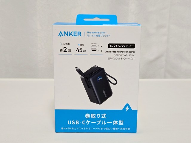2025年9月より登場したのが「Anker Nano Power Bank(10000mAh, 45W, 巻取り式 USB-Cケーブル)」。ANKERによると、大容量&高出力が特徴の、ケーブル内蔵モバイルバッテリーの決定版となるモデルなのだそう。