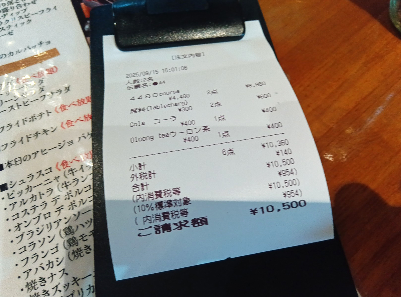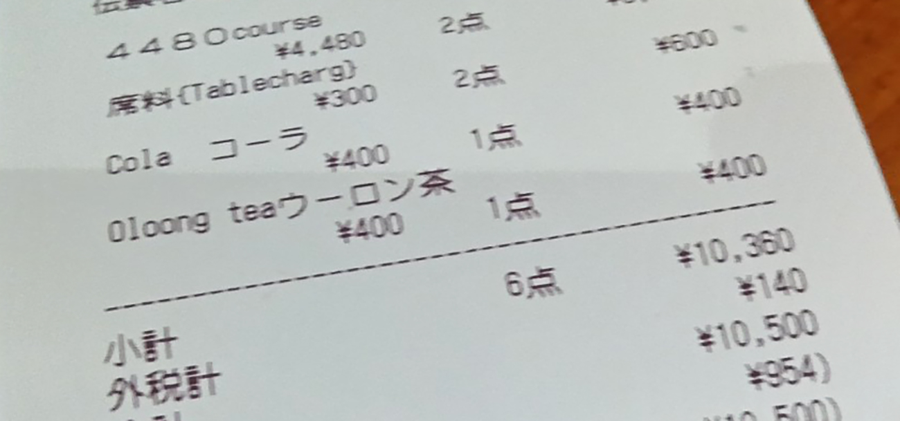 謎の外税140円の後に謎の200円値引き。もはや意味が分からない。確かなことはただ1つ。4480円コースだと1人あたり5250円かかったということだけである。