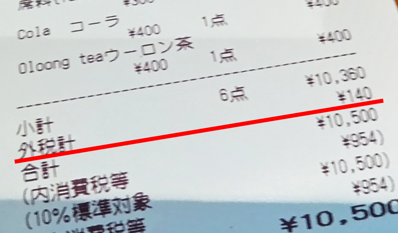 内消費税は別に記載されているからこの外税が何を意味しているのか私には分からないけれど、とりあえず2人で140円かかっているようだ。食べ放題料金の中にサービス料でも含まれててその税金とかなんだろうか? しかも……