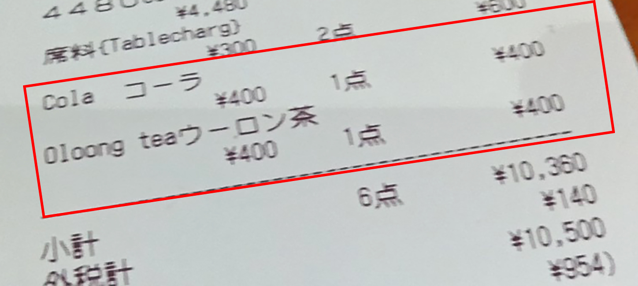 メニューに500円と記載されていたソフトドリンクが400円になっている……! ウェイターさんも「500円」って言ってたのに!?